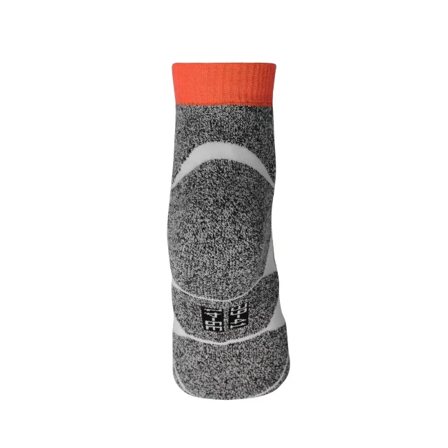 62% poliestere, 20% poliammide, 16% cotone, 2% elastane. Calzini in tessuto traspirante e regolatore di umidità, cuciture piatte, tessuto rinforzato nell'area della punta e della pianta.