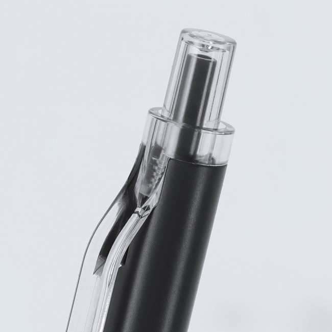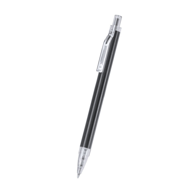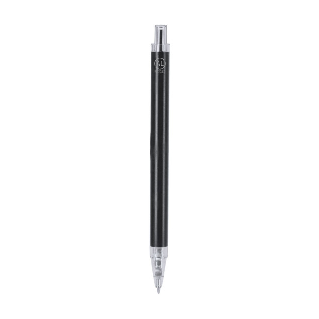 Penna con corpo in alluminio riciclato. Clip e pulsante, punta con finitura trasparente. Carica gigante e con inchiostro blu. Include il distintivo in alluminio riciclato.
