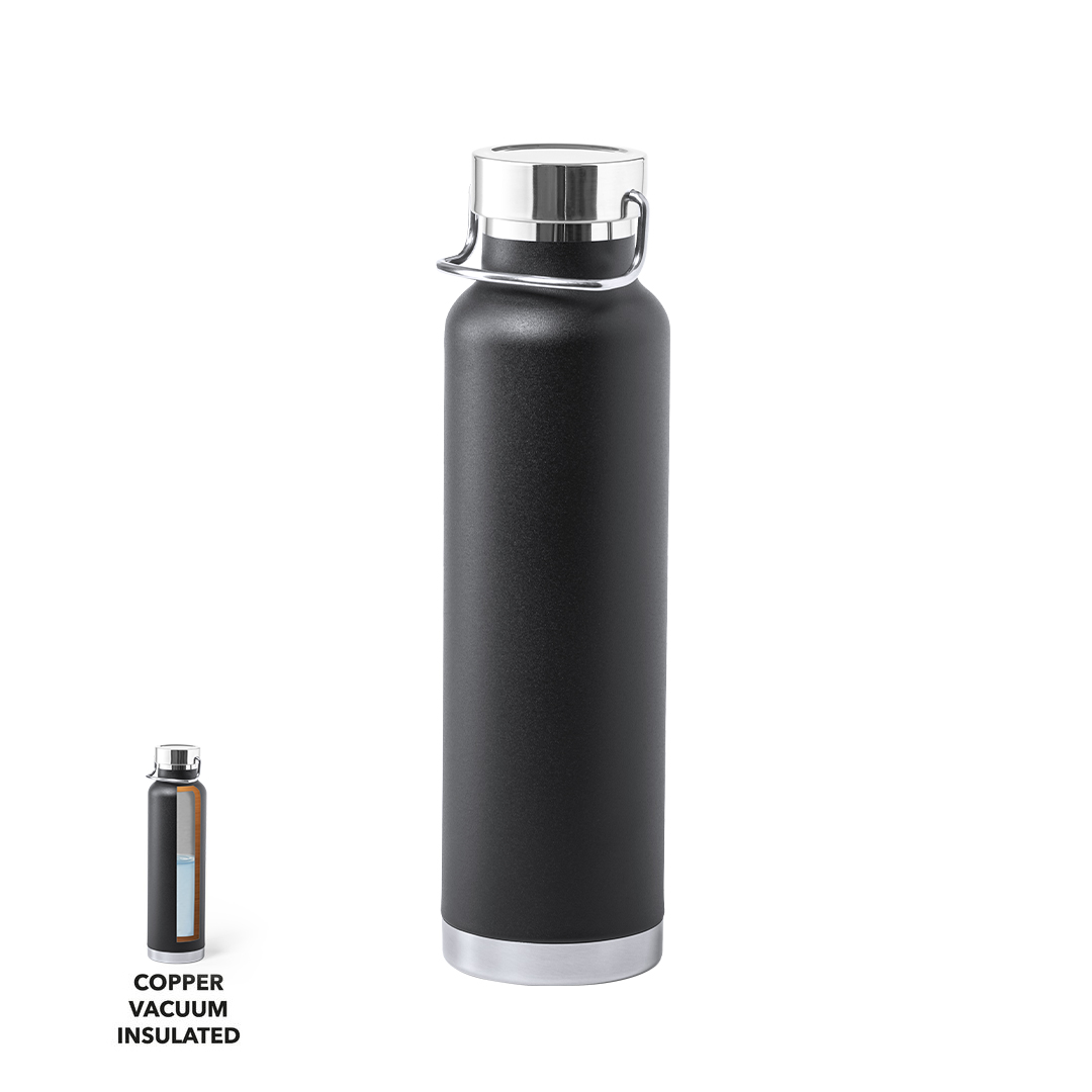 Borraccia termica in acciaio inossidabile,a doppio strato e isolamento in rame sottovuoto. Permette di mantenere il caldo e il freddo più a lungo, raggiungendo rispettivamente le 12 e le 48 ore. Con una capacità di 650 ml e disponibile in un'ampia gamma di colori metallizzati . Confezionata singolarmente in un'attraente scatola di design.