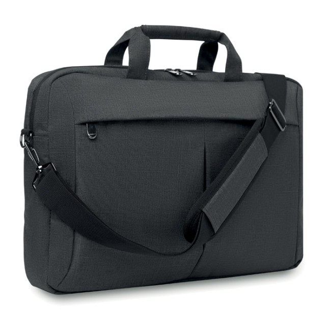 Borsa porta pc in poliestere 360D. PC da 15 inch, comparto centrale con laterali imbottiti. Tasca esterna con zip e tracolla staccabile. Strap per trolley sul retro.