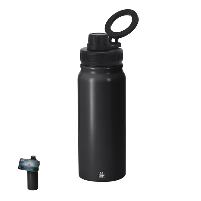 Bottiglia termica da 600 ml di capacità, realizzata in Acciaio Inox Riciclato a doppia parete. Con funzione di supporto magnetico rotante per smartphone. Priva di BPA. Include distintivo di acciaio inox riciclato. L'acciaio è uno dei materiali più richiesti e che può essere trovato quasi ovunque, da prodotti di uso quotidiano a grandi costruzioni. Con innumerevoli proprietà, tra cui la durabilità e l'elevato grado di riutilizzo, lo rende un'alternativa molto apprezzata nelle soluzioni di sostenibilità. Adeguatamente trattato, consente di ottenere nuove risorse di utilizzo infinito.