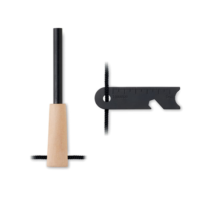 Strumenti per l'accensione del fuoco, realizzati in legno di pino e acciaio inossidabile. Comprendono un bastoncino per l'accensione, un raschietto multiuso, un apribottiglie, un righello di precisione e una chiave esagonale. Un set completo per chi ama il campeggio e le attività all'aperto.