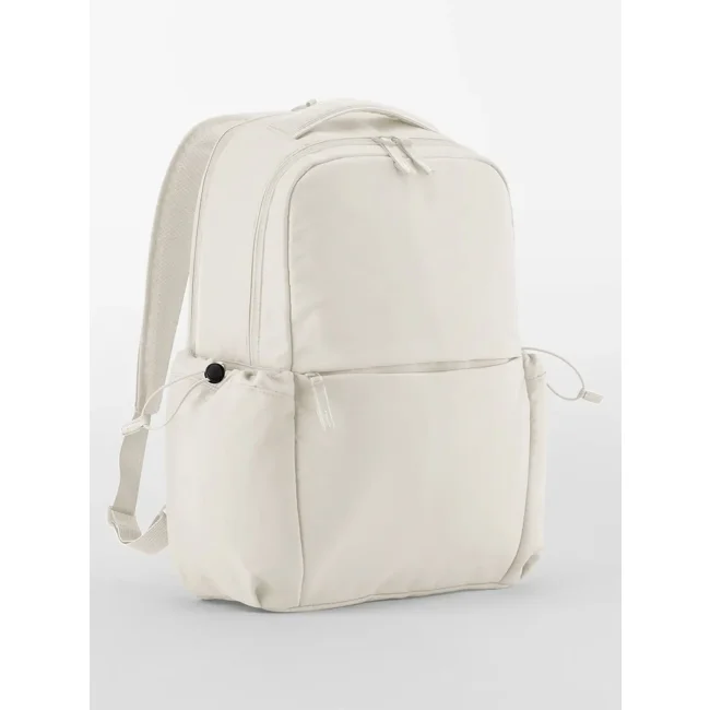 100% poliestere riciclato. Zaino per laptop fino a 16'' in poliestere riciclato certificato GRS, apertura con due zip bidirezionali, tasche laterali esterne regolabili con cordino, tasca frontale con zip e due tasche interne imbottite, cinghia posteriore per bagaglio. Dimensioni: 44x29x13cm, Capacità: 22 litri. Etichetta strappabile.