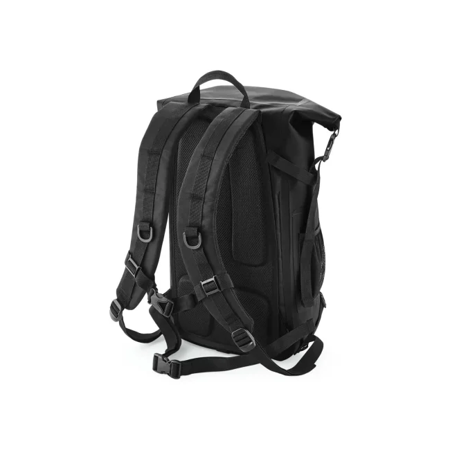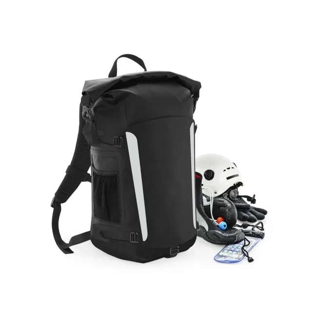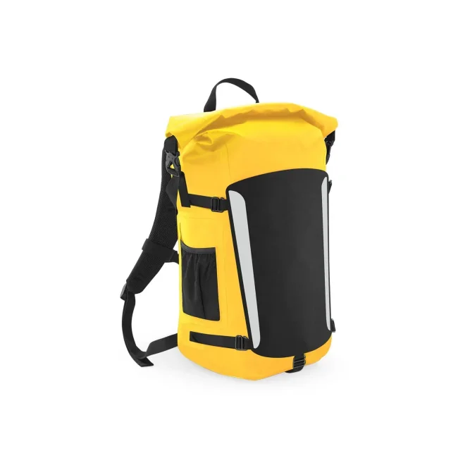 100% telone resistente in PVC. Zaino impermeabile con doppio EasyPanel™decorativo, tasca esterna a rete, pannello posteriore imbottito in materiale traspirante, spalline in rete imbottite. Dimensioni: 30 x 51 x 21 cm, capacita': 25 litri, area di stampa: 15 x 30 cm.