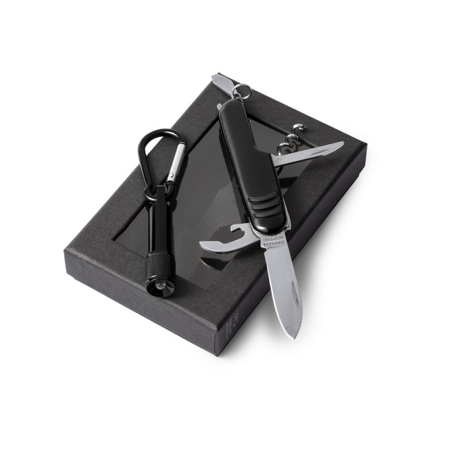 Set composta da coltellino multiuso in alluminio con 7 funzioni e torcia a moschettone. Disponibile in diversi colori e presentato in una custodia individuale con finestra e interno in morbida schiuma fustellata. Batterie a bottone incluse.
