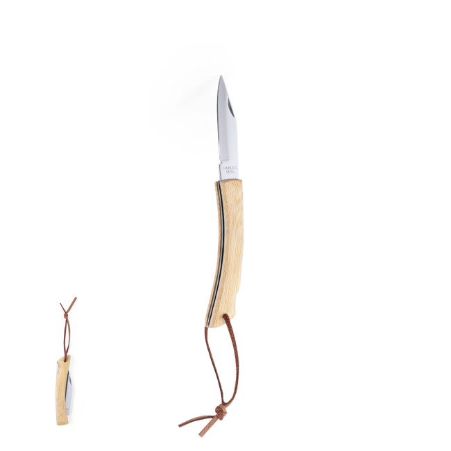 Coltellino della linea Nature con lama in acciaio inox e manico in bambù forte con blocco di sicurezza. Con tracolla in similpelle e confezionato singolarmente in una scatola.