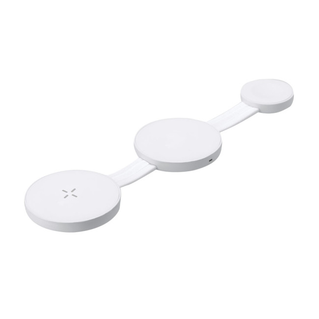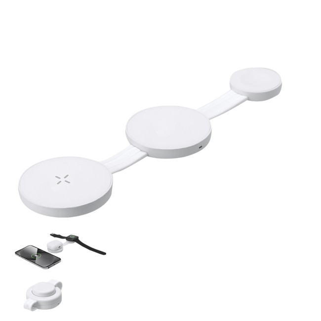 Caricatore wireless magnetico da 15W da 3 in 1, realizzato in ABS. Progettato per la ricarica simultanea di smartphone, cuffie e smartwatch, ed è ultra-compatto per dimensioni. Un gadget tutto-in-uno: pieghevole, portatile, altamente versatile e progettato funzionalmente. Connessione USB di tipo C -cavo incluso-.
