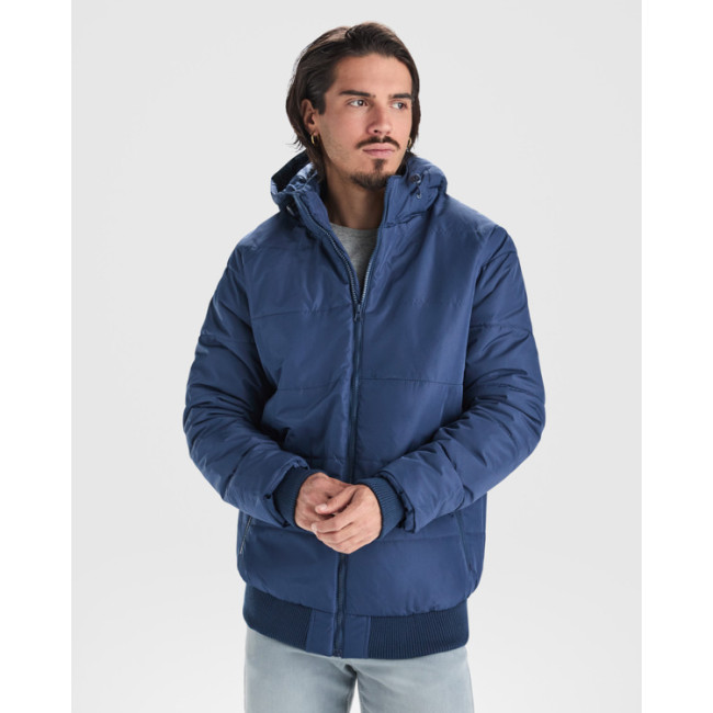 Giubbotto imbottito idrorepellente. Cappuccio removibile con regolatori. Zip frontale abbinata. Protezione per il mento in tessuto uguale. Polsini e orlo a coste 1x1. Tasche laterali con zip abbinata. Accesso esterno sul lato sinistro del petto e sulla schiena con zip invisibile per la rilavorazione.