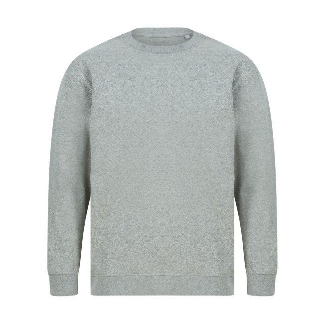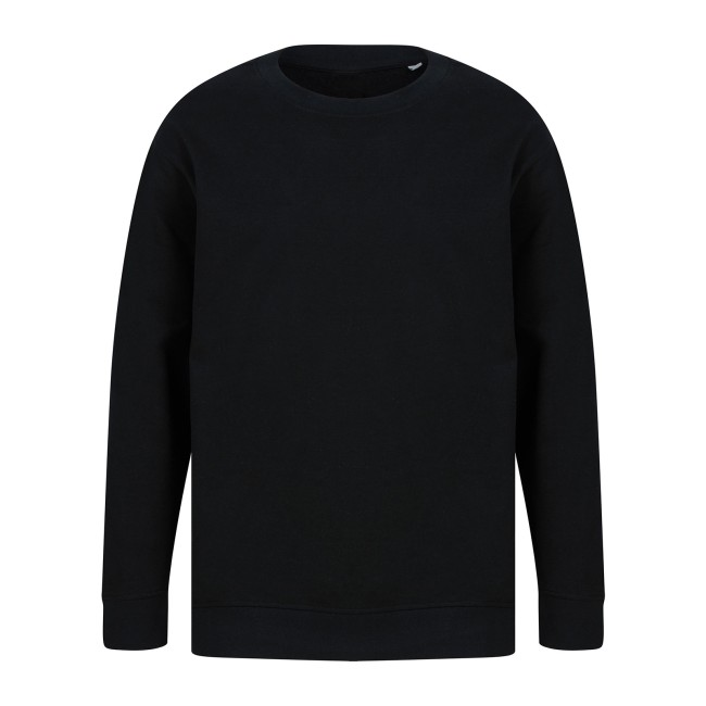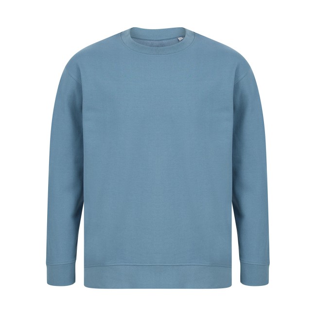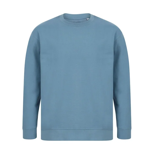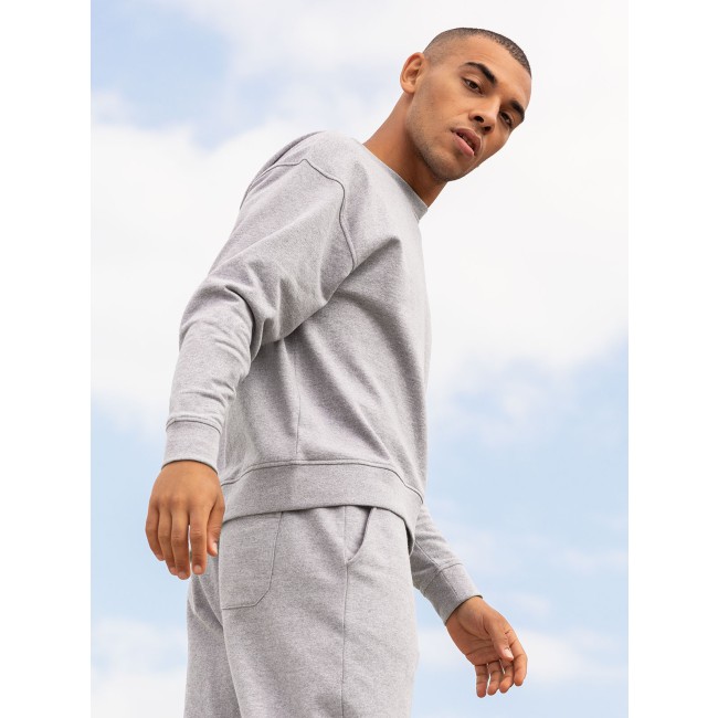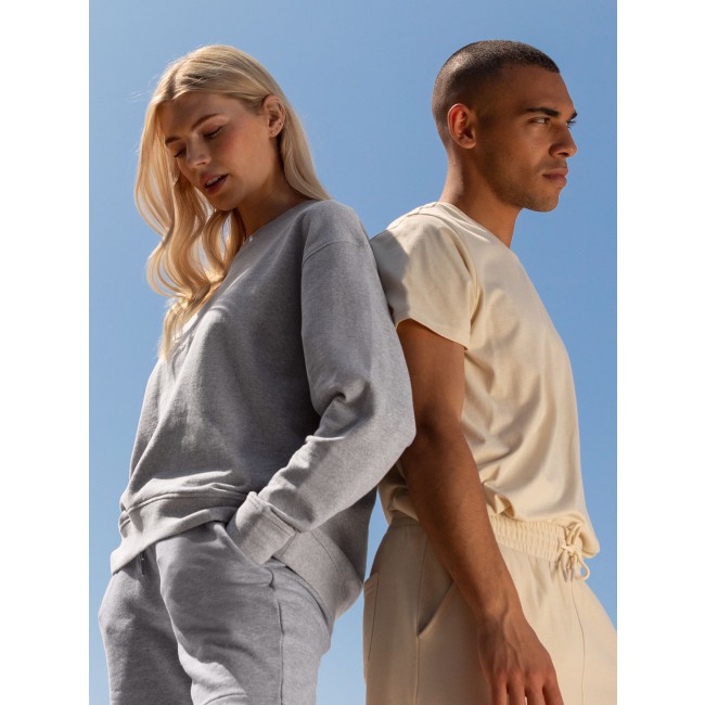 60% cotone rigenerato 40% poliestere riciclato. Felpa girocollo unisex, maniche set-in con design spalla cadente, vestibilità ampia, felpata internamente. Orlo asimmetrico più corto sul davanti, girocollo e polsini a costine. Nastro di rinforzo sul collo in single jersey, cuciture in tono. Etichetta senza brand. Busta riutilizzabile 100% plastica riciclata.