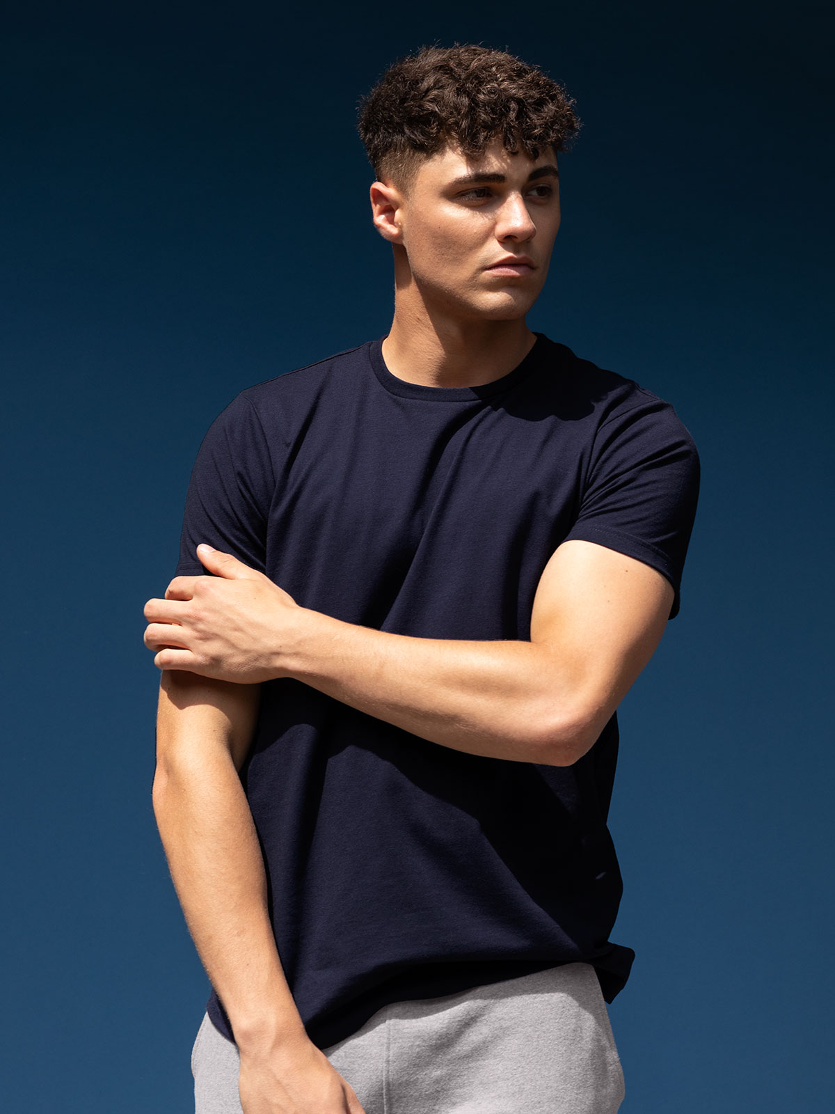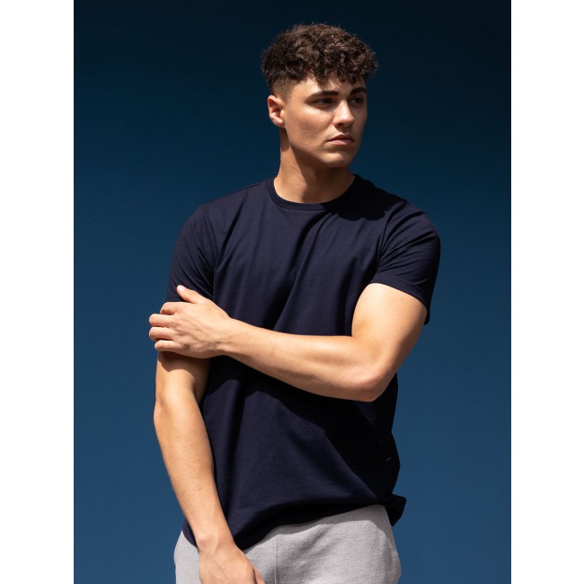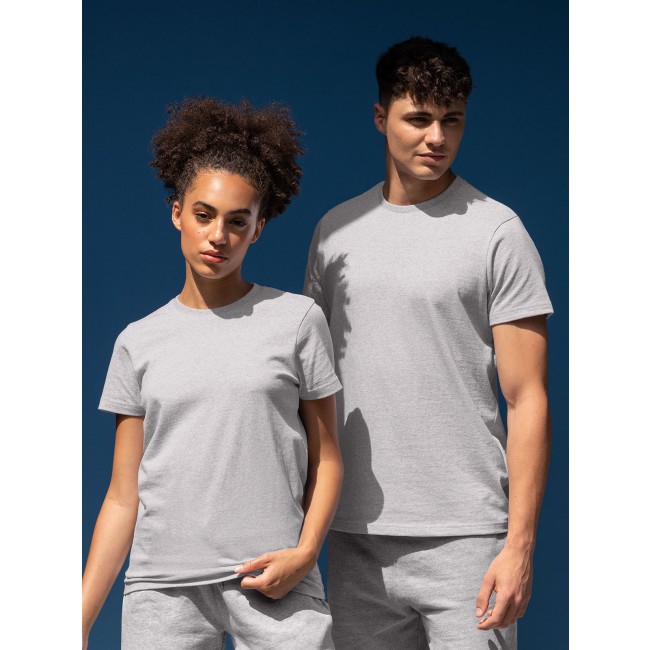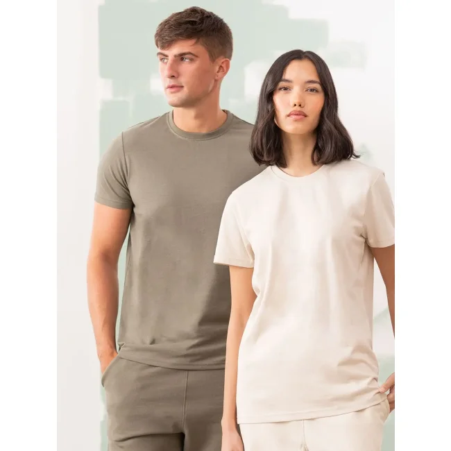 60% cotone rigenerato 40% poliestere riciclato, single jersey. T-shirt unisex maniche set-in con design spalla cadente, vestibilità ampia. Girocollo in costina, cuciture doppie su maniche e orlo. Etichetta senza brand. Busta riutilizzabile 100% plastica riciclata.