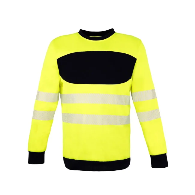 65% cotone, 35% poliestere. Felpa ad alta visibilità, EN ISO 20471:2013/A1:2016, classe 3, due strisce riflettenti larghe 5cm attorno a busto e maniche, scollo tondo e polsini neri a coste, ampia area di stampa del torace, il produttore garantisce le proprietà riflettenti secondo la norma EN per 25 cicli di lavaggio a 60°C, dotato di codice a barre EAN, confezionata singolarmente