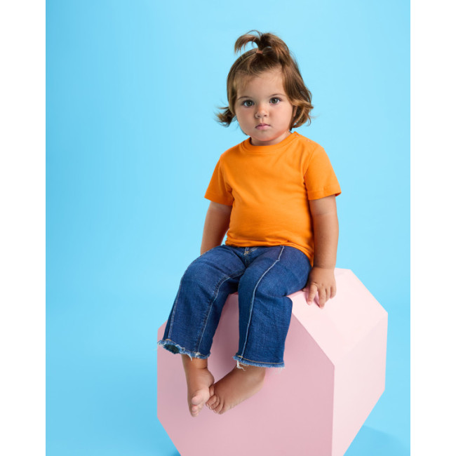 T-shirt per bebè a manica corta, realizzata in cotone a maglie fini e compatte. Presenta un girocollo e un'apertura sulla spalla con bottoncini metallici per le taglie 6m-18m. La taglia 2A non ha apertura sulla spalla, garantendo una vestibilità comoda e pratica.