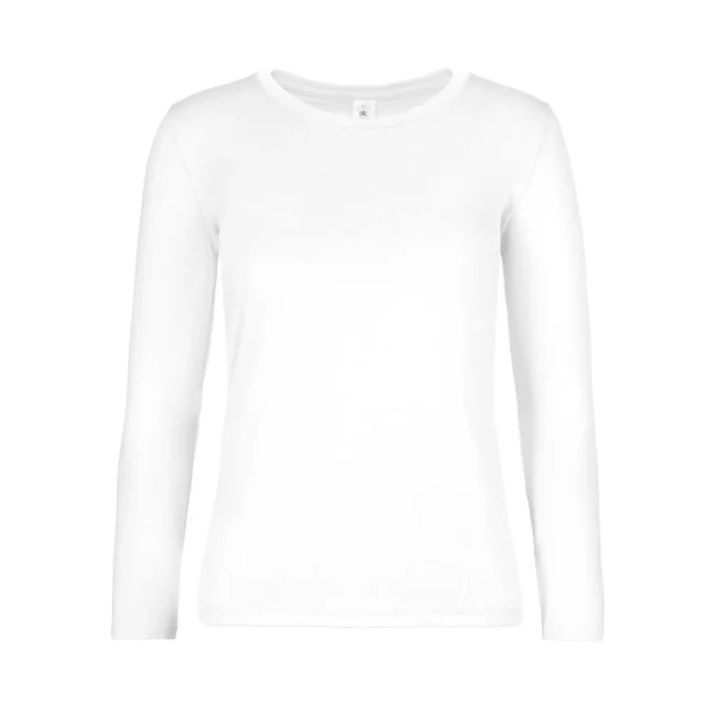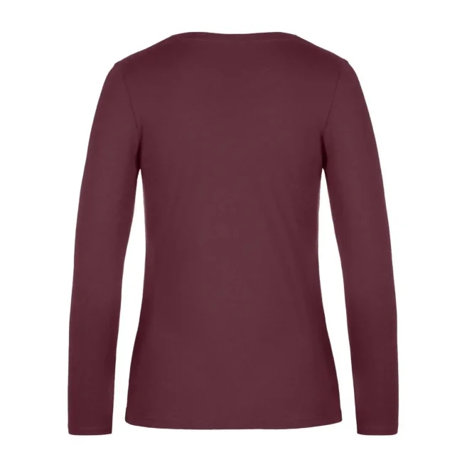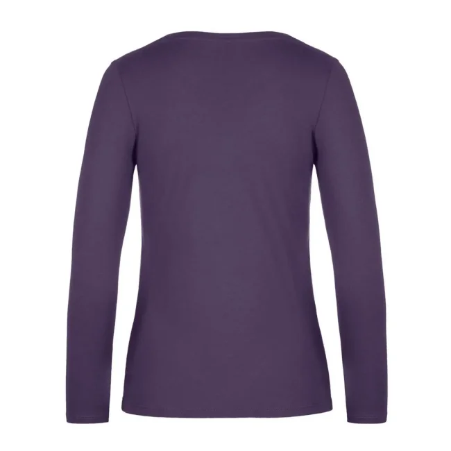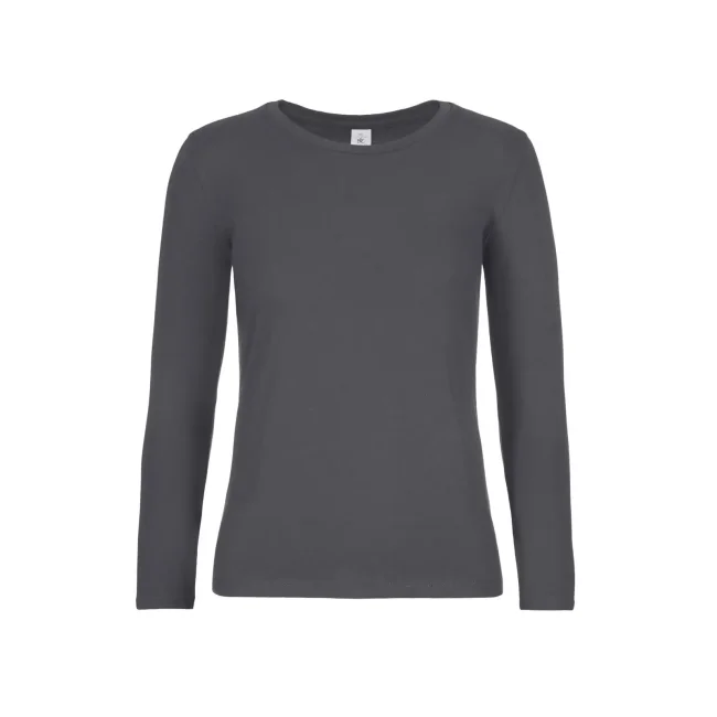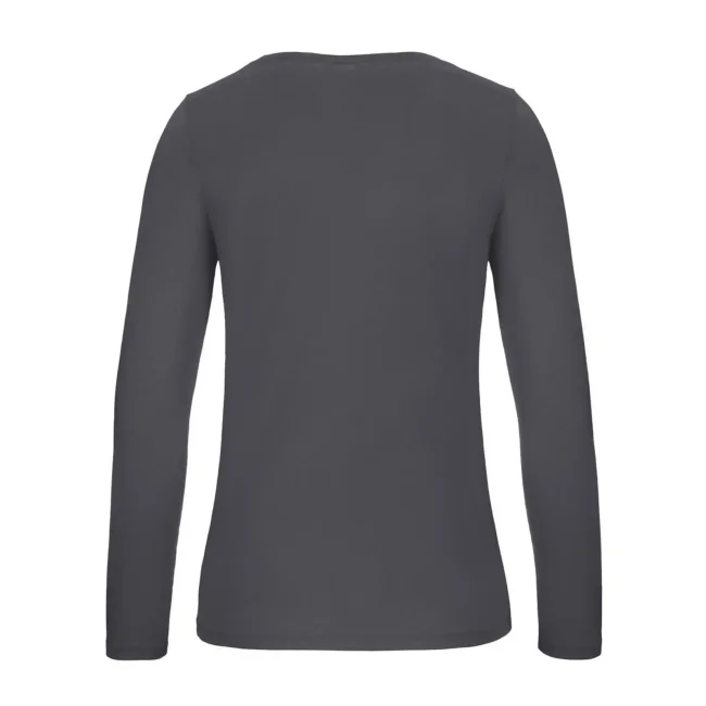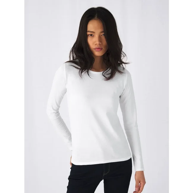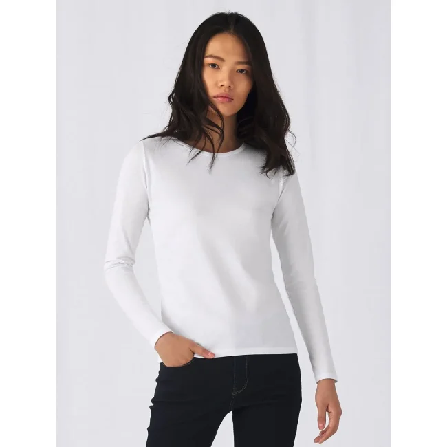 T-shirt a manica lunga B&C #E190 LSL da donna, realizzata in 100% cotone ring-spun preristretto. Presenta una struttura con cuciture laterali e un collo a costina sottile, risultando leggermente sfiancata. Il tessuto resistente e pesante è ideale per la personalizzazione con logo, mentre l'assenza di etichetta garantisce comfort.
