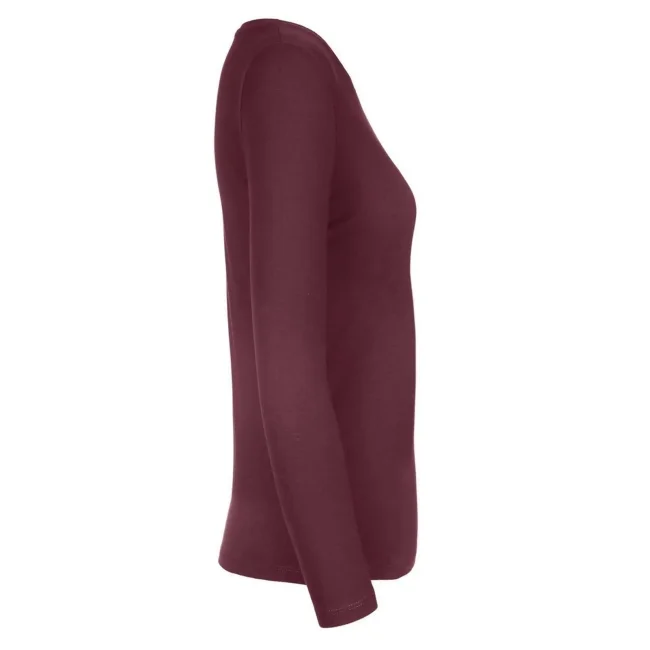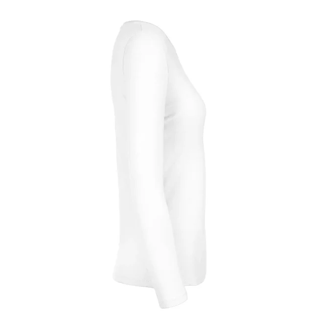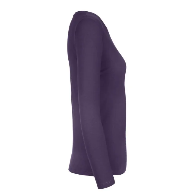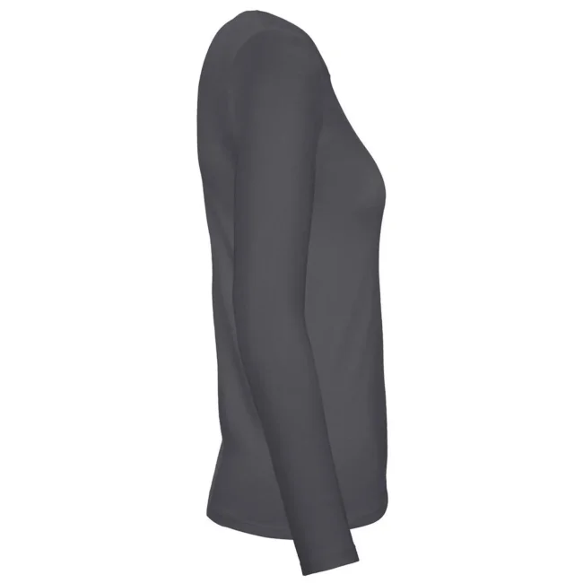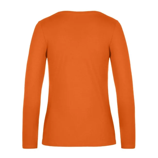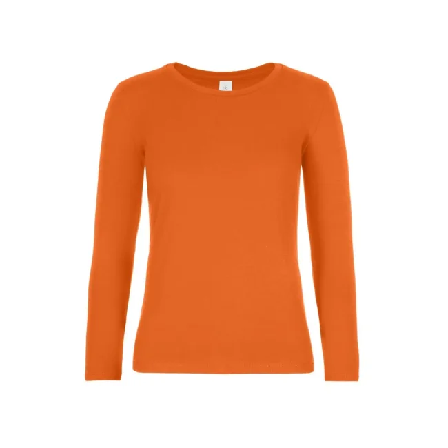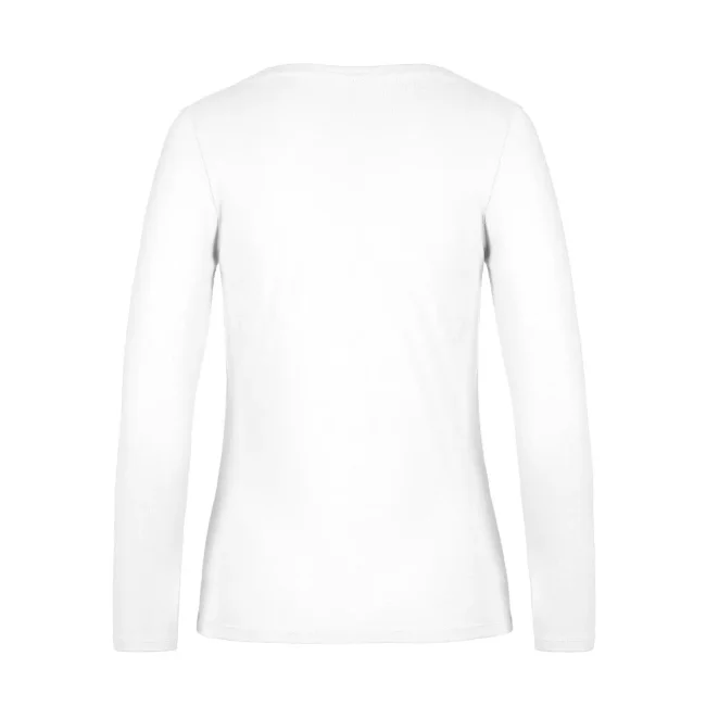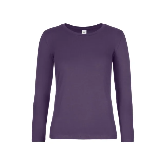 T-shirt a manica lunga B&C #E190 LSL da donna, realizzata in 100% cotone ring-spun preristretto. Presenta una struttura con cuciture laterali e un collo a costina sottile, risultando leggermente sfiancata. Il tessuto resistente e pesante è ideale per la personalizzazione con logo, mentre l'assenza di etichetta garantisce comfort.
