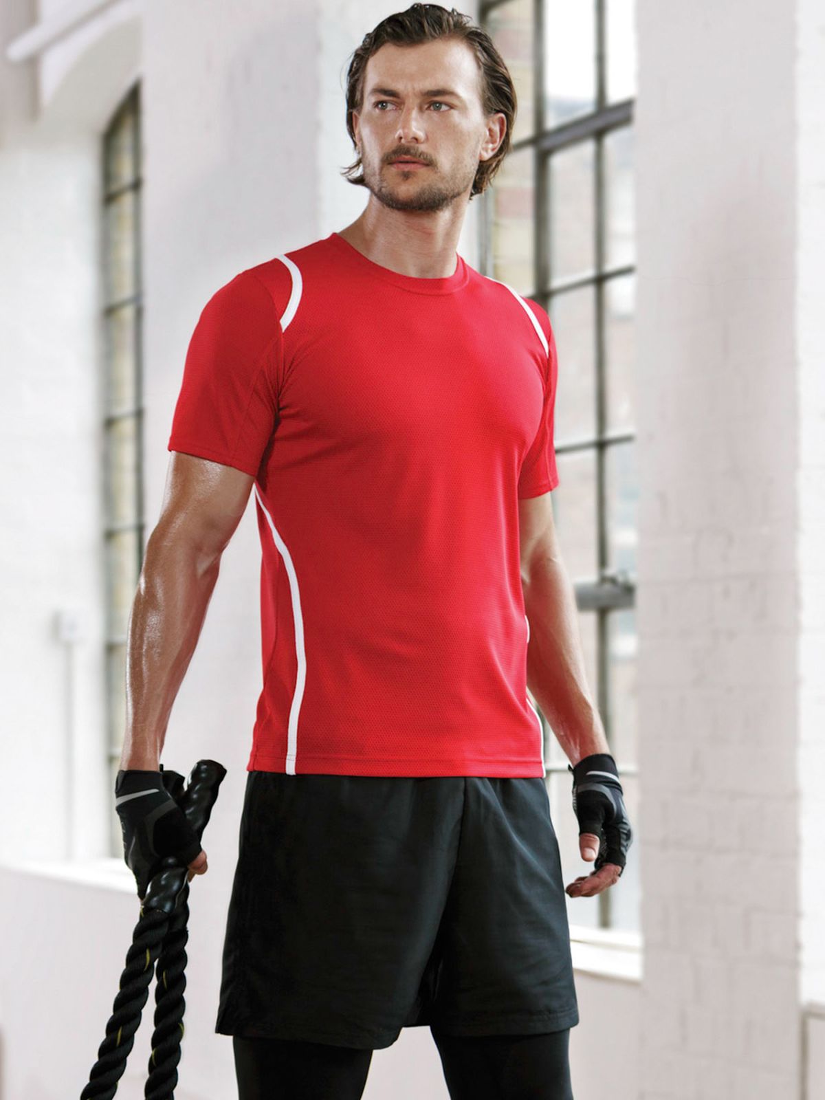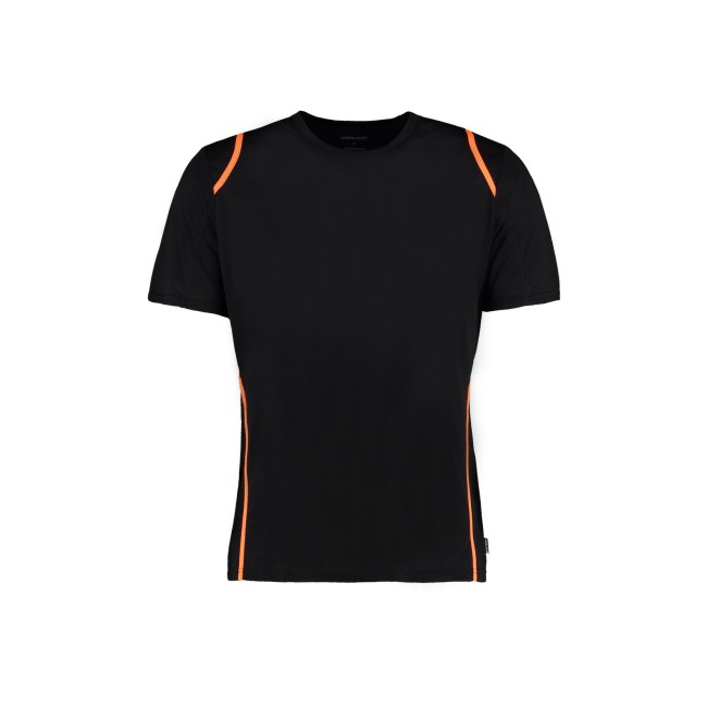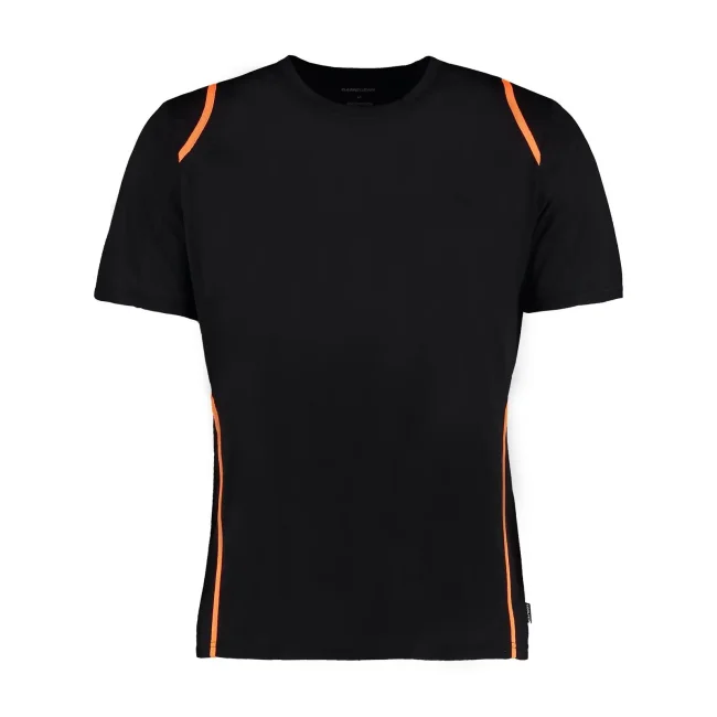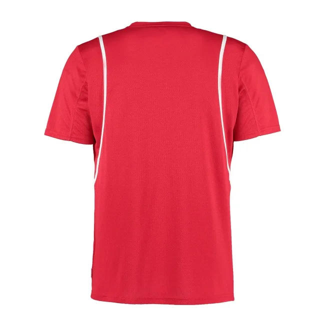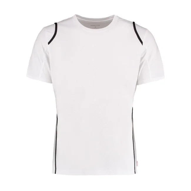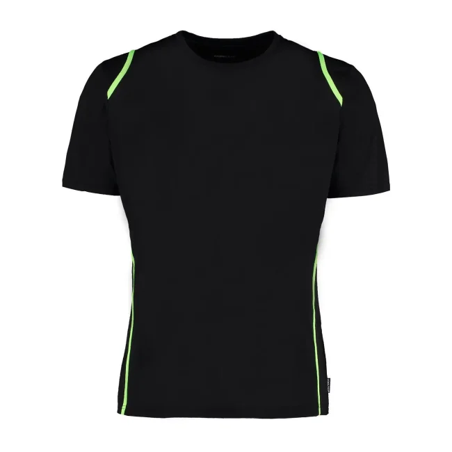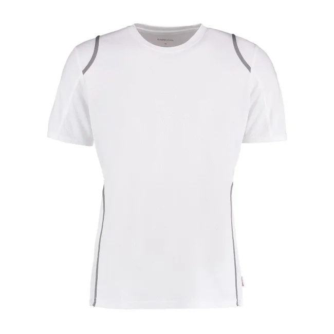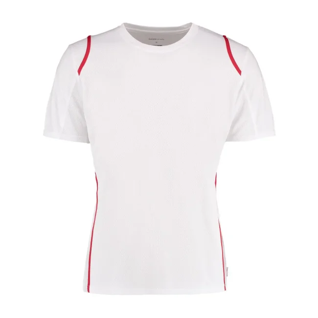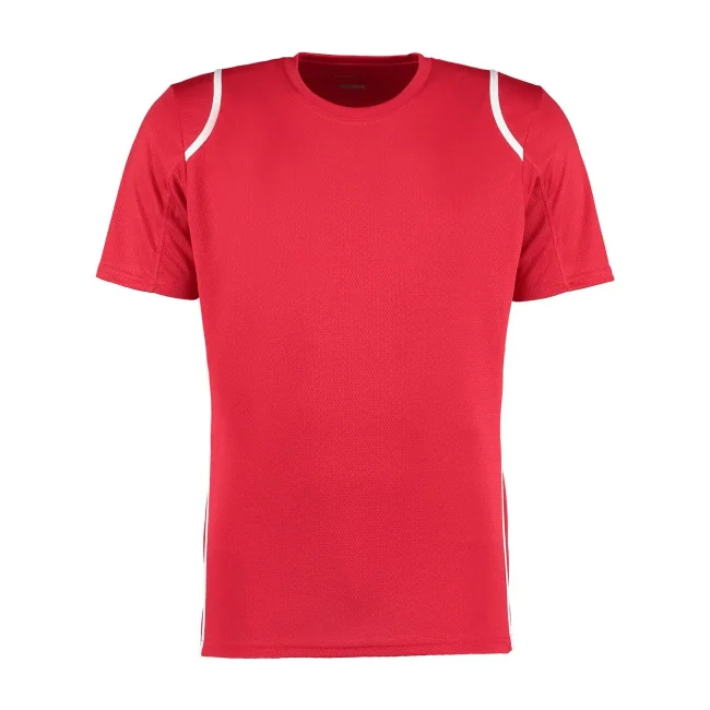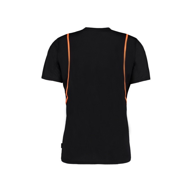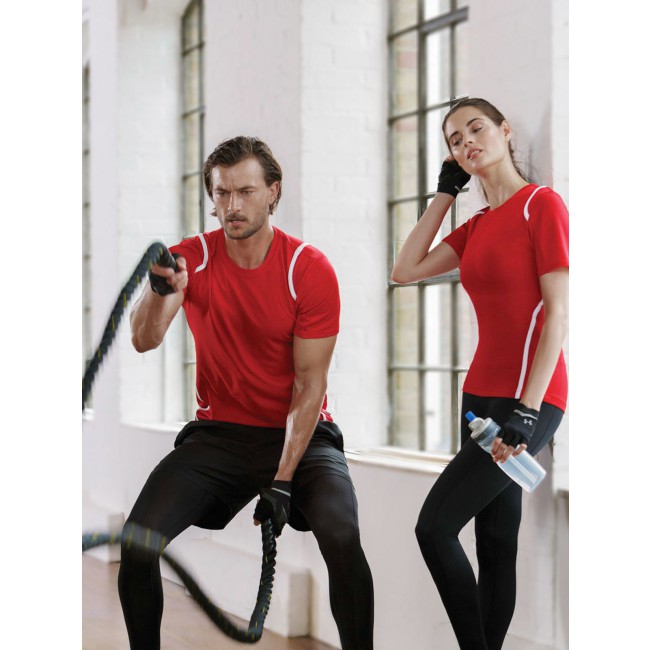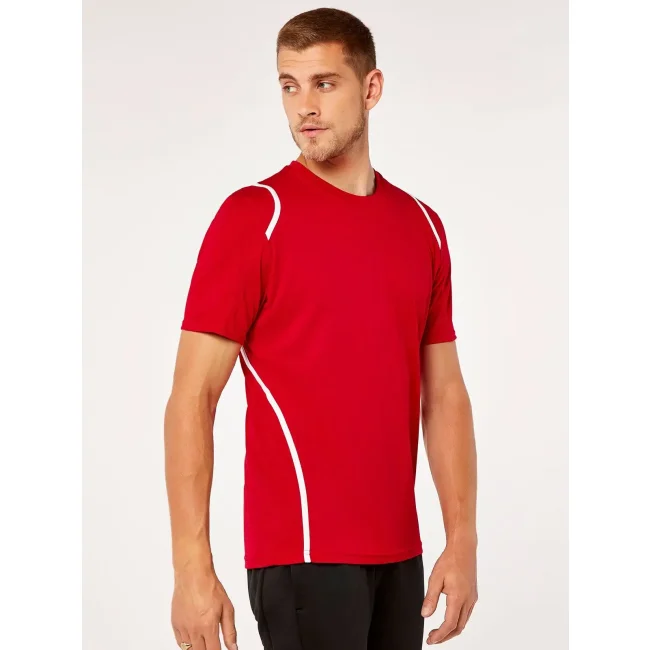 100% poliestere. T-shirt maniche set-in, traspirante, girocollo con fettuccia interna, sottili inserti in contrasto su spalle, schiena e fianchi, struttura con cuciture laterali.
