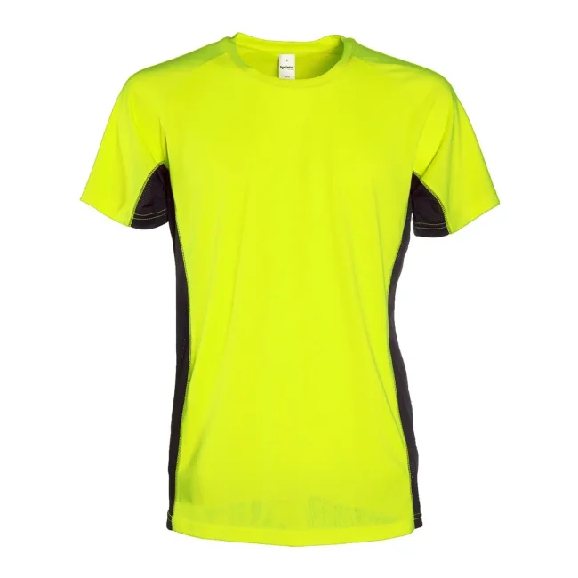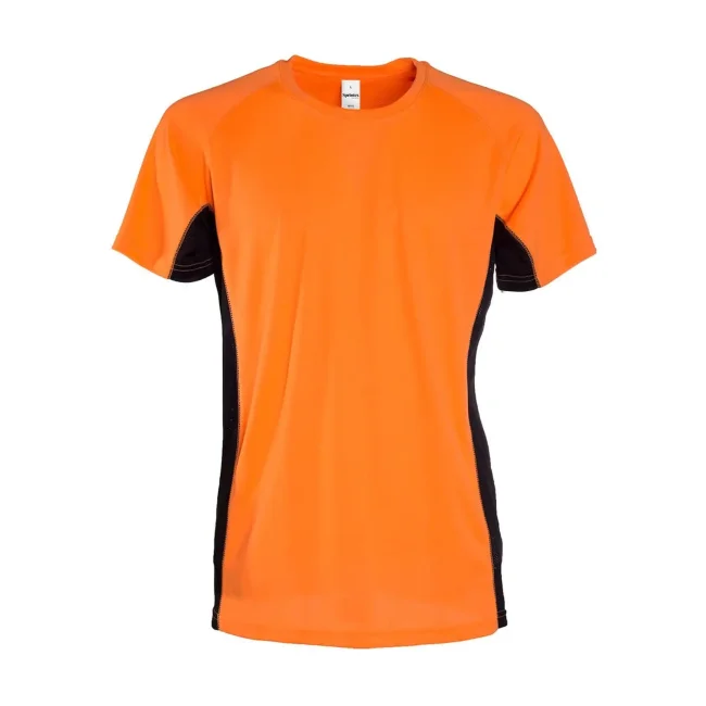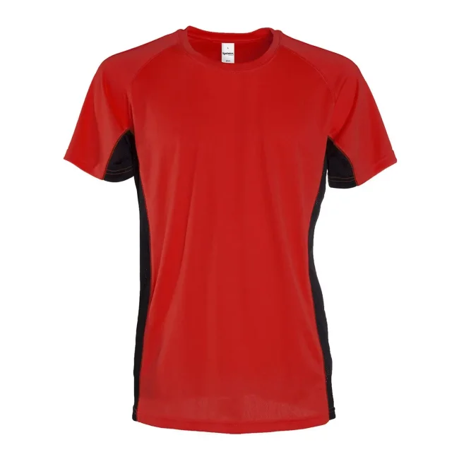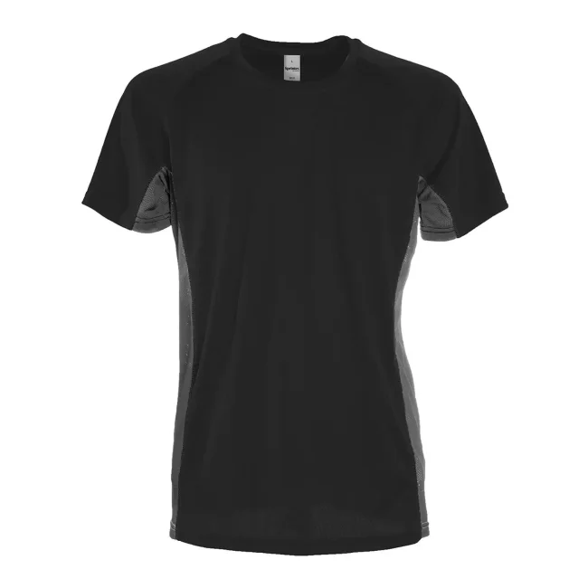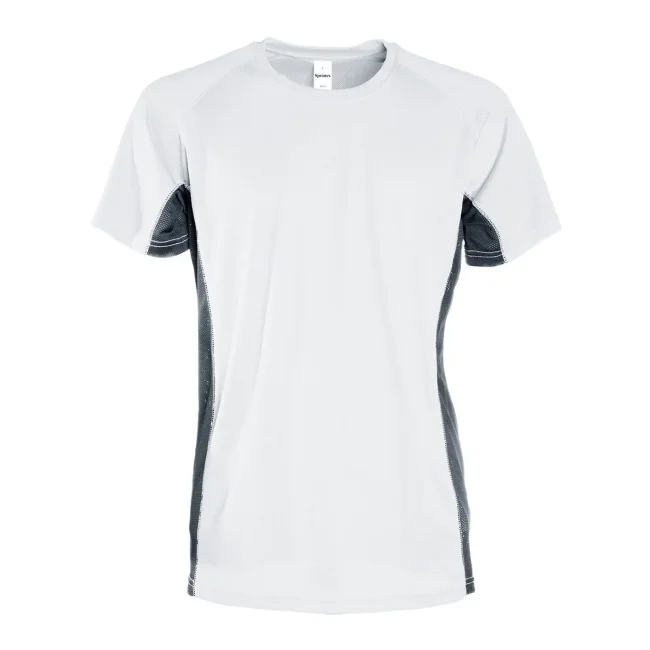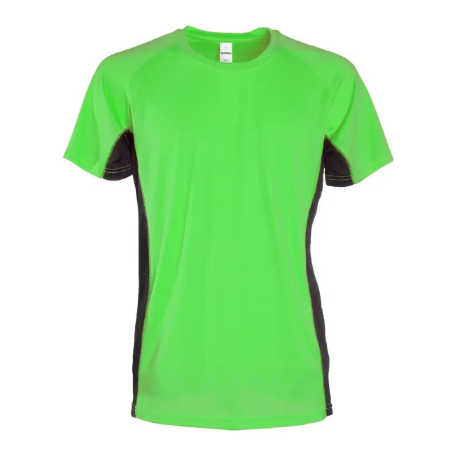 100% poliestere. T-shirt maniche corte raglan, struttura con fasce laterali in tessuto microforato di colore contrastante, nastro parasudore al collo.