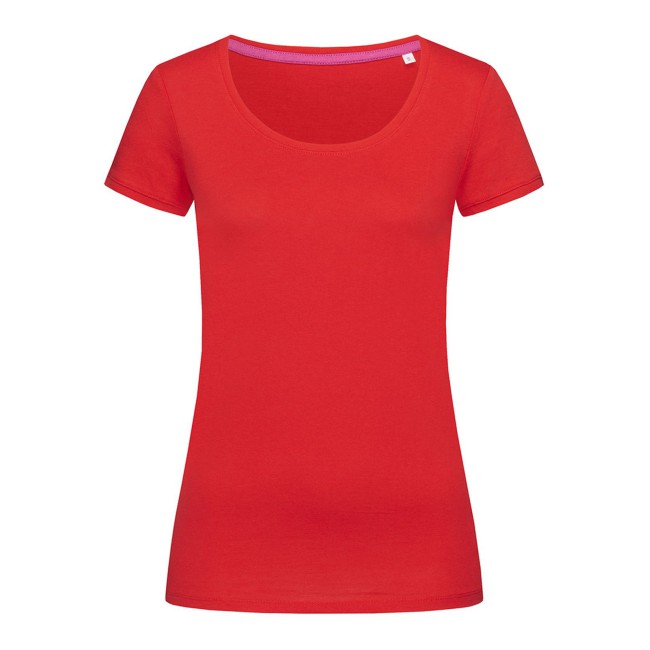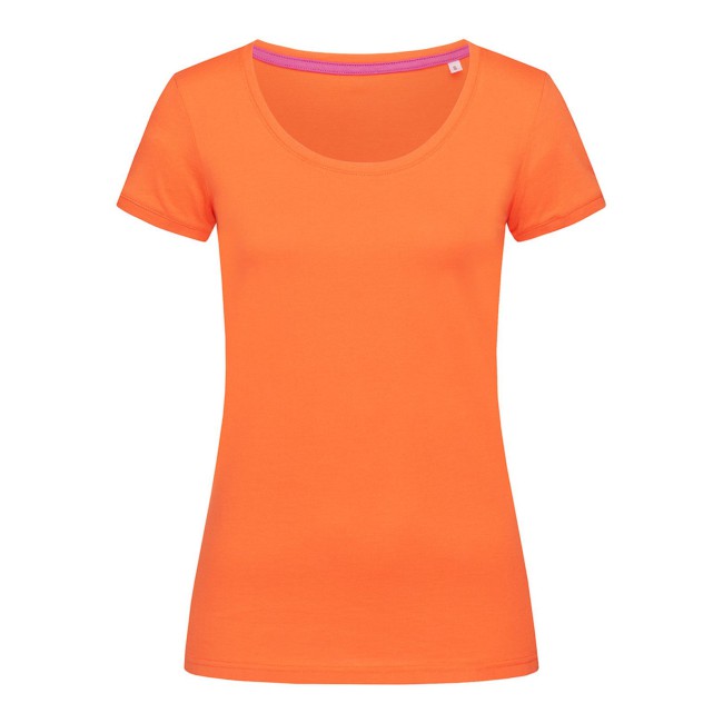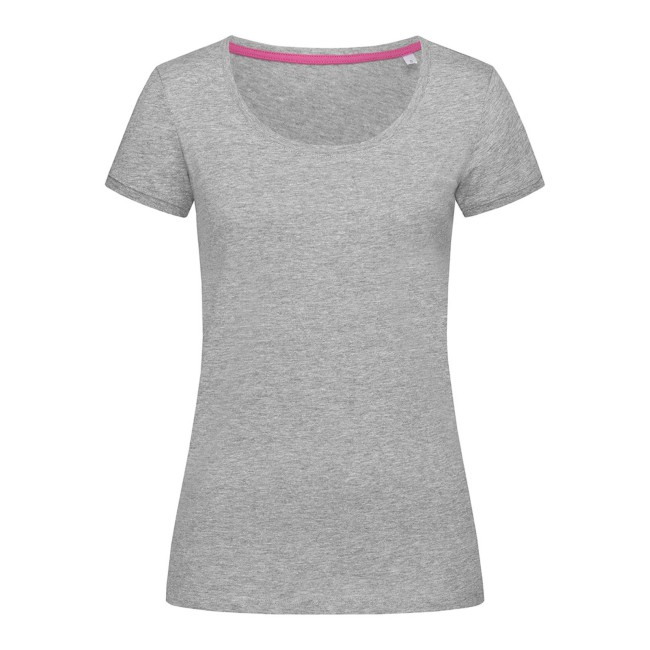 100% cotone ring-spun. Single jersey. T-shirt manica corta girocollo con fettuccia interna in colore a contrasto, ampio scollo, giromanica in costina sottile, leggermente sfiancata, struttura con cuciture laterali, etichetta strappabile, lavabile a 40°C. Col. GYH: 85% cot. 15% visc.
