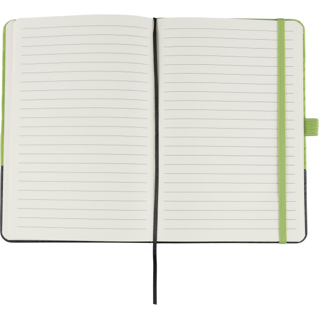 Taccuino formato +/- A5 in poliestere rPET con copertina frontale in PU parzialmente incidibile al laser, dopo l’incisione il colore corrisponde al tessuto rPET, contiene 80 pagine a righe 70 g/m², elastico di chiusura, passante portapenne, segnalibro a nastro, sezione inferiore in PU progettata per l’incisione rivelando il colore corrispondente.