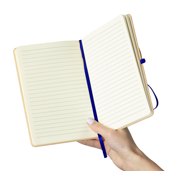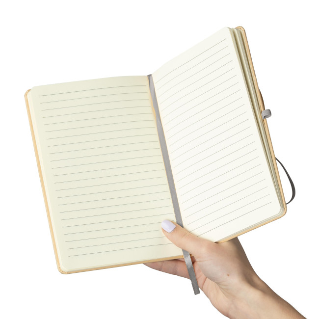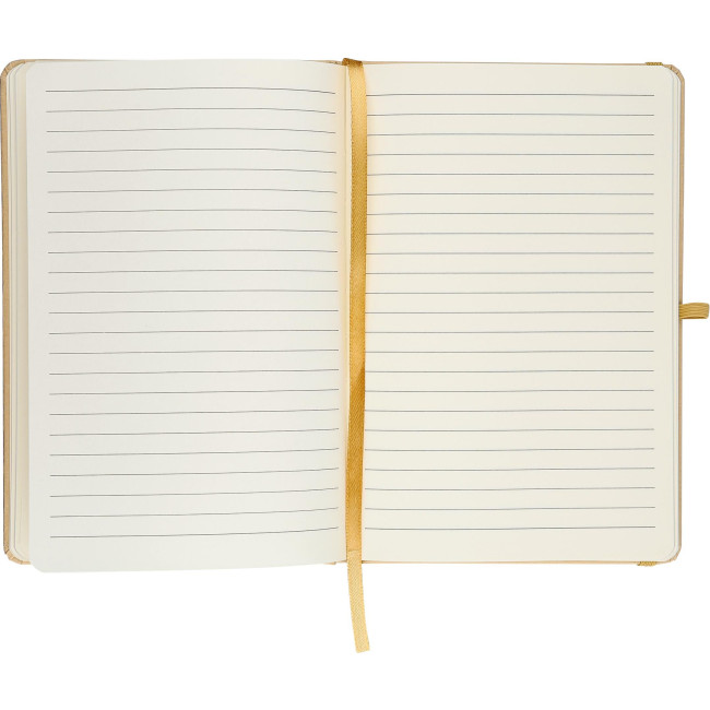 Taccuino formato +/- A5 con copertina rigida in carta kraft e rivestimento in pellicola di alluminio, progettato per l’incisione laser con effetto specchio dopo l’incisione. Contiene 80 pagine a righe di carta da 70 gsm. La carta di questo taccuino è certificata FSC® Mix. Rifinito con dettagli coordinati, tra cui un elastico, un segnalibro a nastro e un passante per penna.