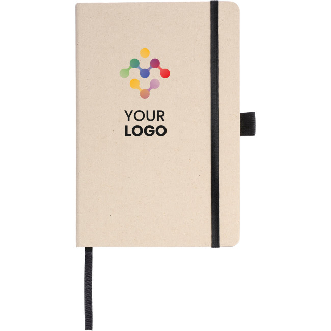 Taccuino in canna da zucchero, formato +/- A5, 80 pagine a righe, passante per penna, elastico e segnalibro, include logo della canna da zucchero in rilievo sul retro della copertina