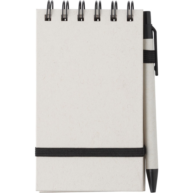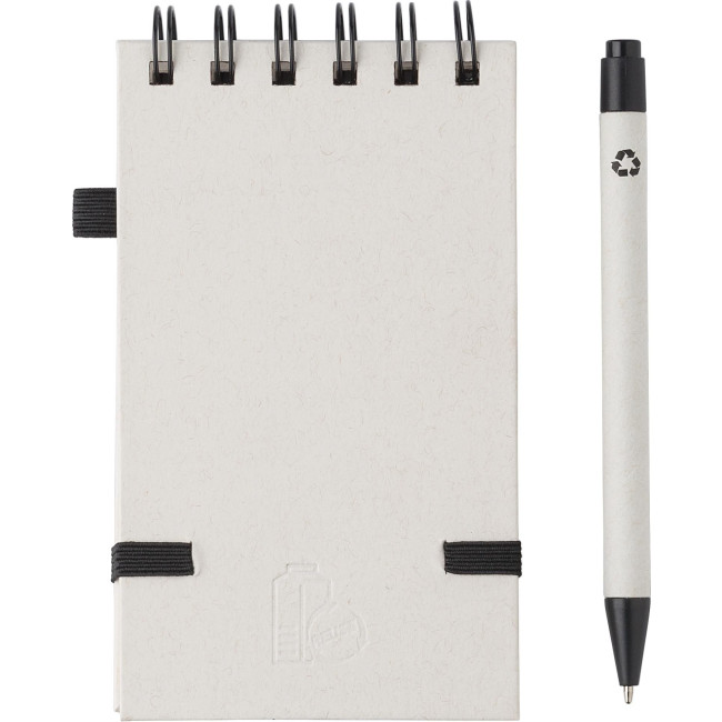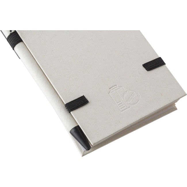 Taccuino in cartone del latte riciclato, 70 fogli, elastico, passante per penna, include penna a sfera con refill blu, realizzato per il 70% in cartone del latte riciclato e per il 30% in carta riciclata, include logo ‘cartone del latte’ stampato a caldo sul retro della copertina