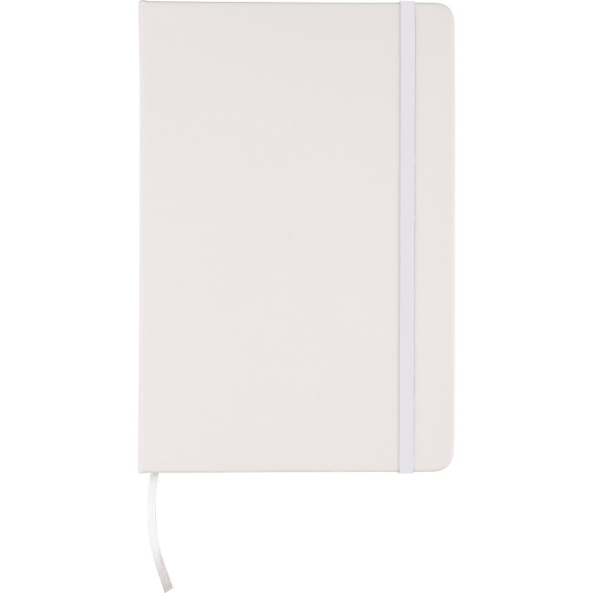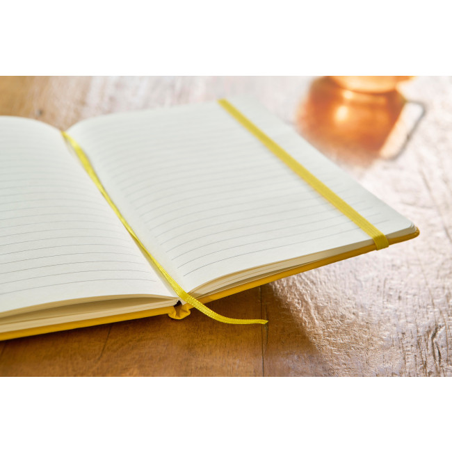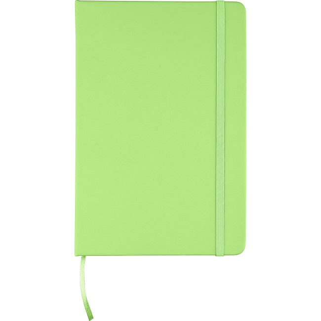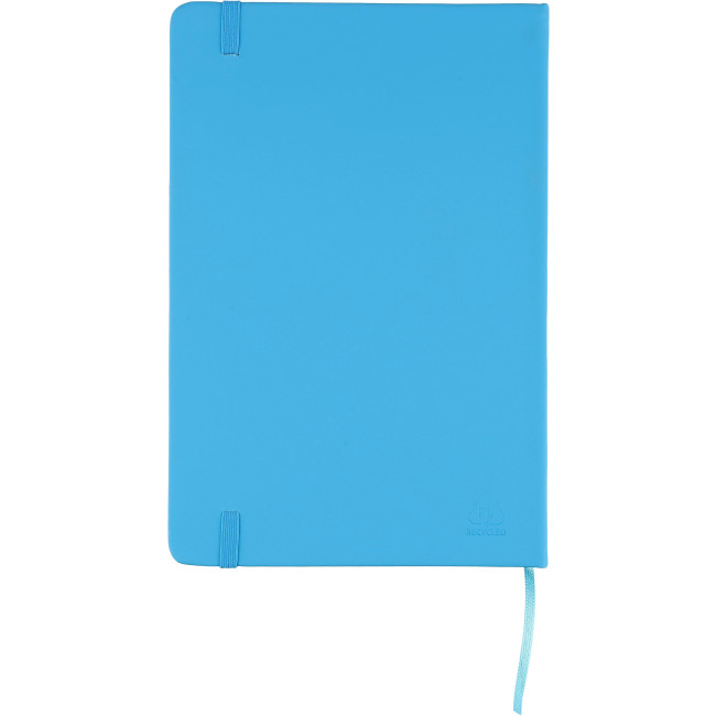 Taccuino in rPET, formato +/- A5, copertina rigida in PU rPET, contenente 80 pagine a righe g/m2, elastico e segnalibro in tinta, include logo ‘PU riciclato’ stampato a caldo sul retro.