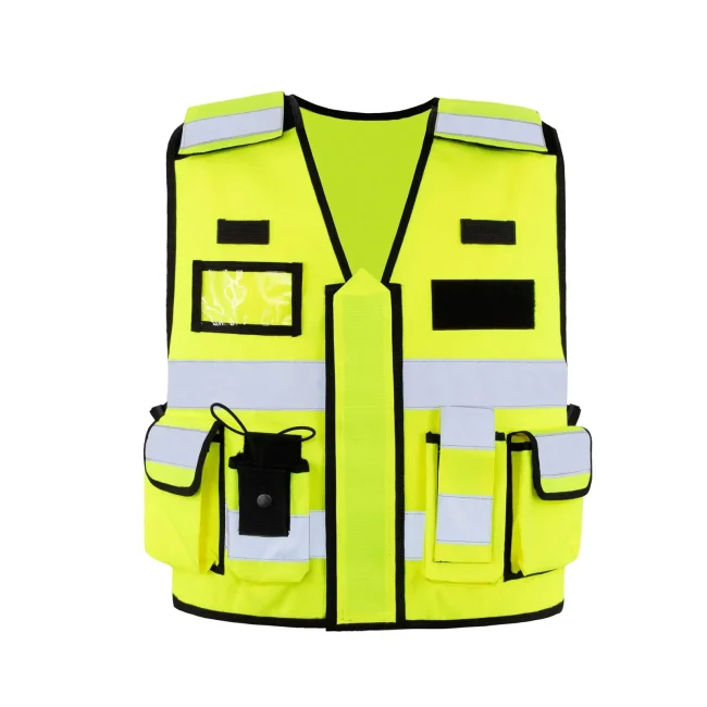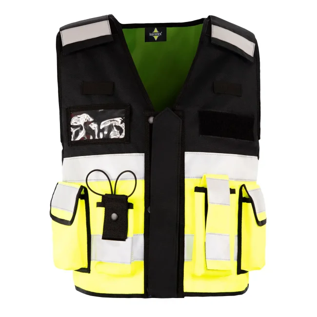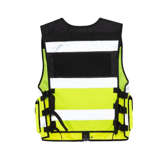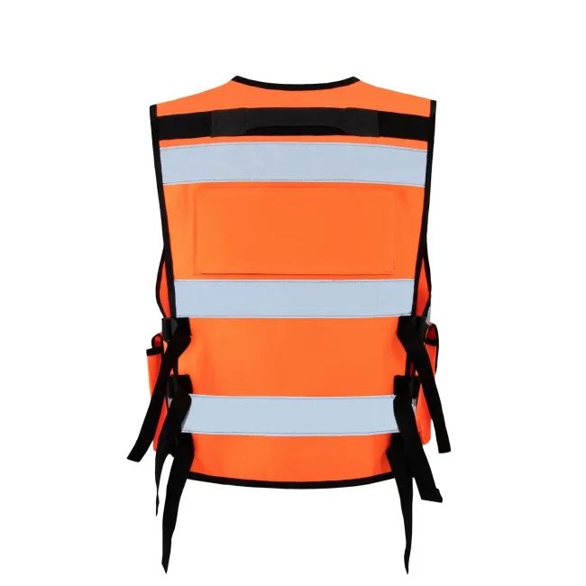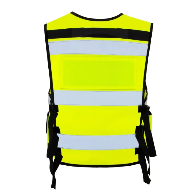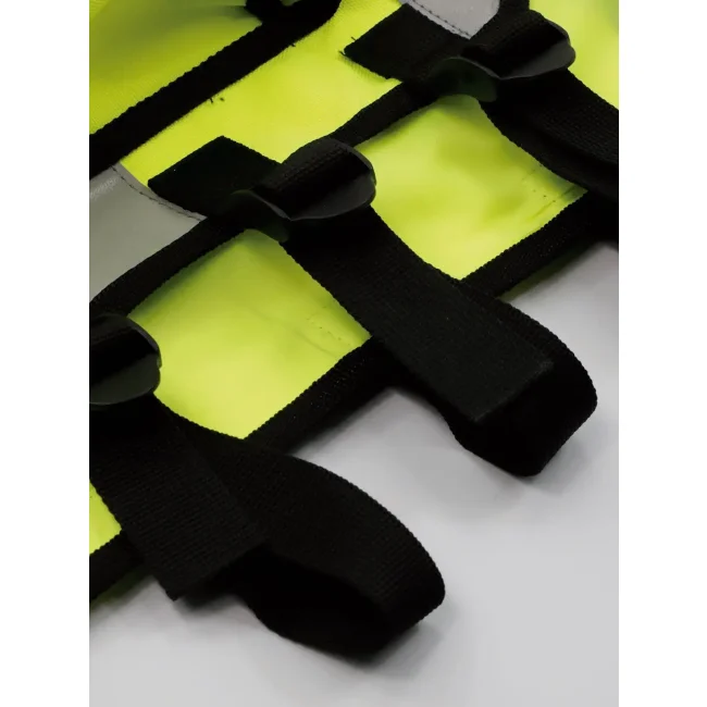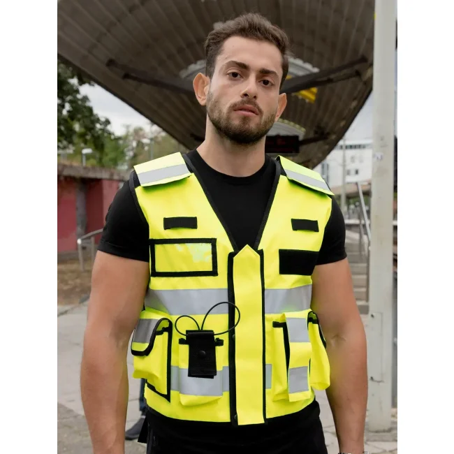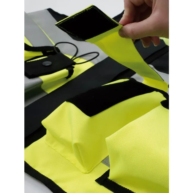 100% poliestere, Oxford 600D. Gilet di sicurezza multifunzione, con strisce riflettenti larghe 5 cm attorno al corpo e sulle spalle, chiusura con cerniera, tasche multiple con patte in velcro, zone in velcro frontali e posteriori, confezionato singolarmente.