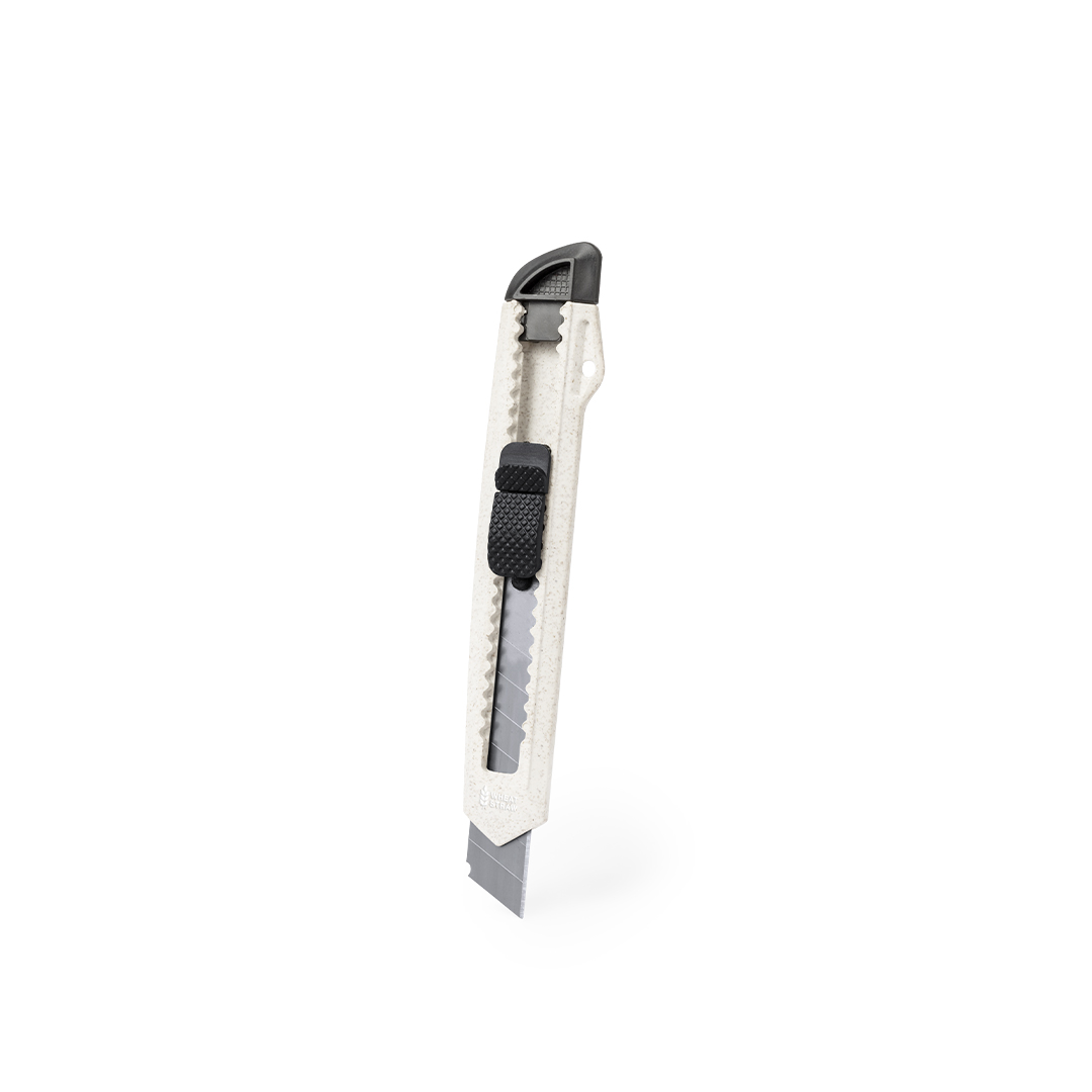 Taglierino Rowe dotato di lama larga in fibra di grano, progettato con impugnatura ergonomica e cappuccio rimovibile per la regolazione della lama. Include un meccanismo di blocco per la sicurezza e viene presentato in un sacchetto di carta riciclata, promuovendo l'uso di materiali naturali.