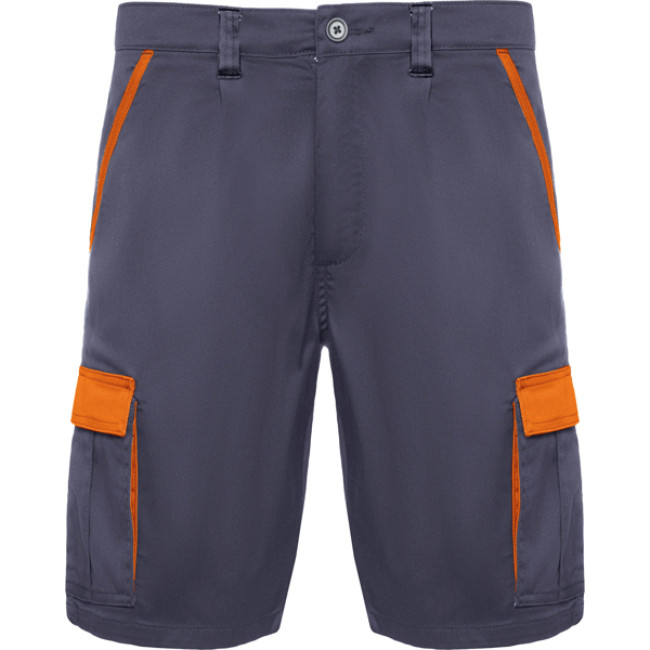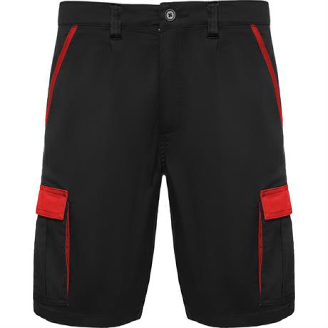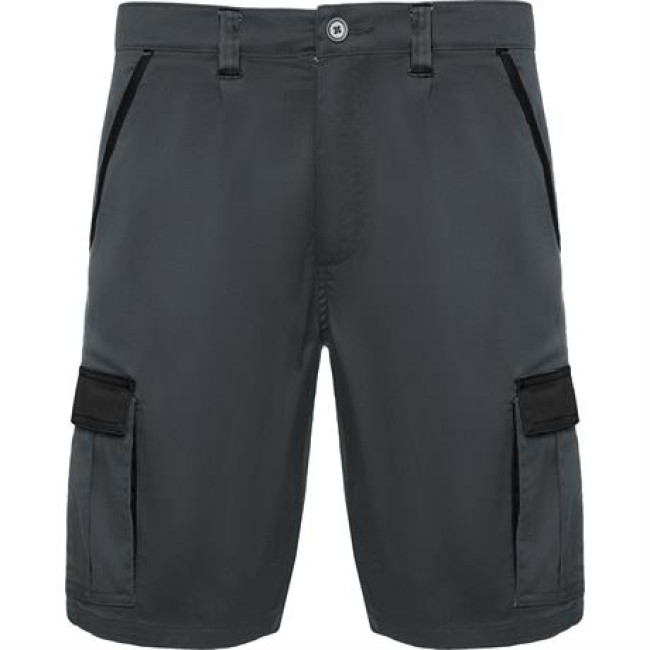Pantaloncini in colori abbinati a tessuto comodo e flessibile. · Elastico in vita regolabile sul retro e passanti, revers, soffietti e piping a contrasto. · Due tasche frontali, · due tasche posteriori con chiusura a pattina e velcro e · due tasche laterali a soffietto con chiusura a pattina e velcro.