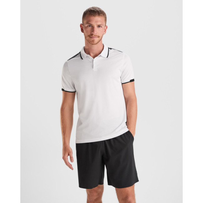 Polo a maniche corte tecnica, bicolore, traspirante. Anti-batterico. Spacchi laterali. Pannelli spalle e giromanica a contrasto. Colletto e polsini a coste 1x1 tono su tono con dettaglio a contrasto. Abbottonatura con bottoni a pressione, uno a vista in colore a contrasto e uno a scomparsa all'interno dell'abbottonatura. Nastratura del colletto in tessuto coordinato e colore a contrasto. Certificazione GRS.