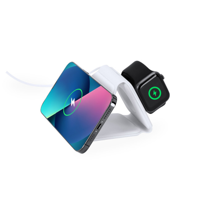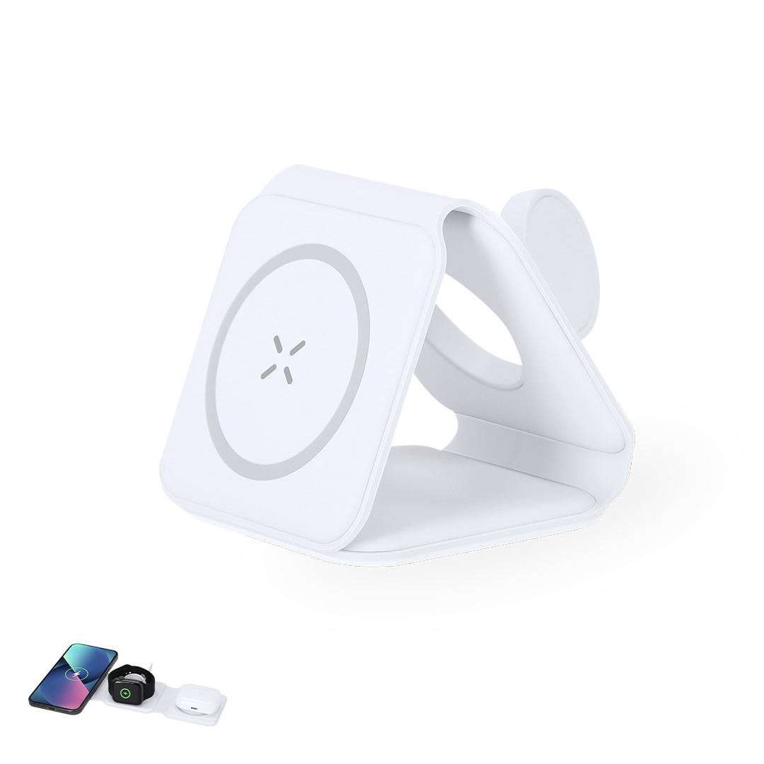 Caricatore wireless magnetico completo 15W, progettato per la ricarica simultanea di smartphone, auricolari e smartwatch. Un gadget tutto-in-uno: pieghevole, portatile, compatto nelle dimensioni, molto versatile e funzionale nel design. Connessione tramite USB Tipo C -cavo incluso- e realizzato in ABS resistente di colore bianco.Prodotto secondo gli standard RoHS e in conformità con i seguenti requisiti di sicurezza:Sistema di protezione contro il surriscaldamento.Sistema di protezione contro il sovraccarico.Sistema di blocco per evitare cortocircuiti.