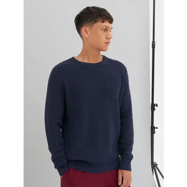 70% Cotone rigenerato, 30% poliestere riciclato. Maglione girocollo, maniche a giro, polsini e collo a costine, maglia in punto riso. Etichetta strappabile.