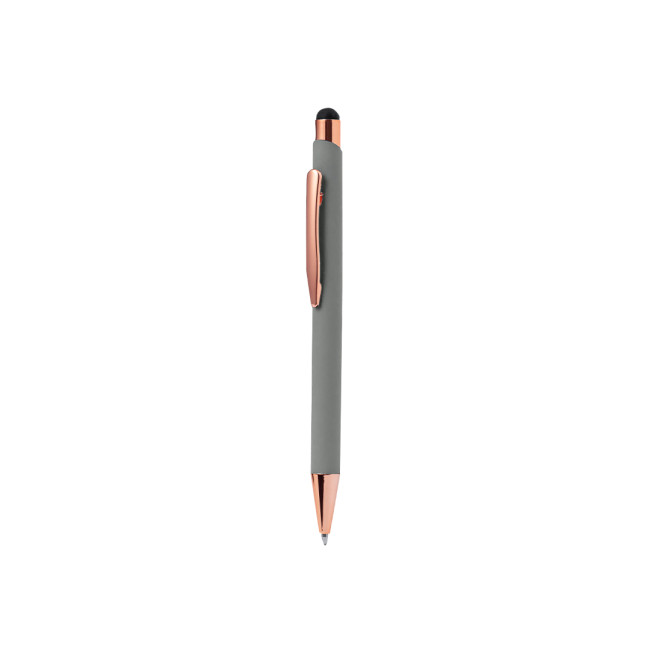 Penna touch in gomma appositamente progettata per la stampa laser con logo rosa. Meccanismo a pulsante, con clip in metallo e dettagli ramati. Fusto disponibile in 4 colori diversi, cartuccia jumbo e inchiostro blu.Presentata in un'elegante scatola nera di design