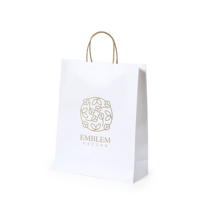 Borsa della linea natura, realizzata in carta riciclata da 100g/m2 in finitura bianca, con manici corti rinforzati in colore naturale e soffietto. Resistenza fino a 6 kg di peso.
