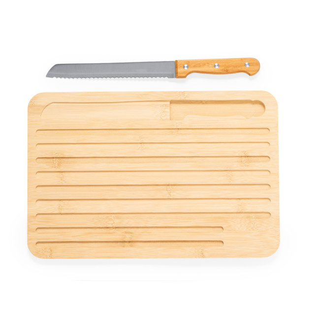 Tavola da cucina in bambù progettata per diverse applicazioni. Un lato liscio e l'altro con scanalature per tagliare pane o cibi succulenti. Include un coltello seghettato con lama in acciaio e manico in bambù, confezionato in una scatola di design kraft.