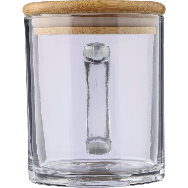Tazza in vetro riciclato, realizzata a base di sodio e calcio, coperchio in bambù che può essere utilizzato come sottobicchiere, confezionata singolarmente in una scatola in cartone avana, capacità 330 ml