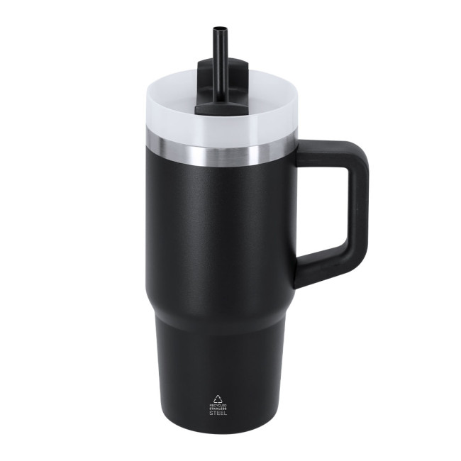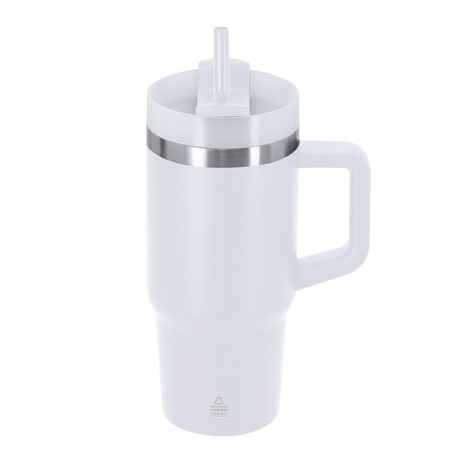 Tazza termica da 450 ml in acciaio inox riciclato, dotata di doppia parete per mantenere la temperatura. Esterno con finitura smussata opaca e coperchio con sistema di chiusura a scatto. Include un foro per bere e un coperchio scorrevole per la cannuccia, rendendola ideale per l'uso quotidiano. Personalizzabile con logo.