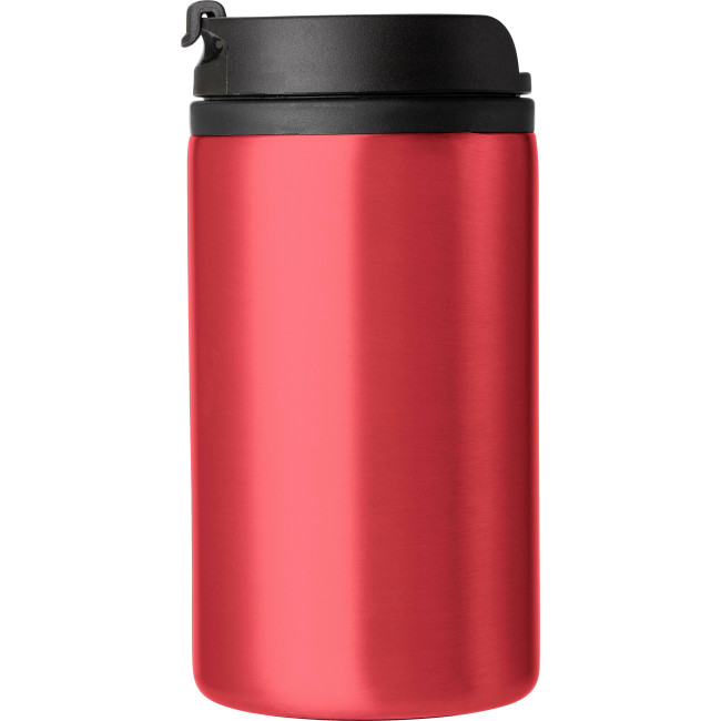 Tazza termica in acciaio inox, doppia parete, esterna in acciaio inox, interna in ABS, coperchio a vite a prova di perdita, dotato di apertura a scatto, impugnatura antiscivolo, capacità 300 ml. A temperatura ambiente maniente approssivamente il liquido freddo 2 ore e caldo 1 ora. Si sconsiglia l'incisione laser sul colore rosso (008).