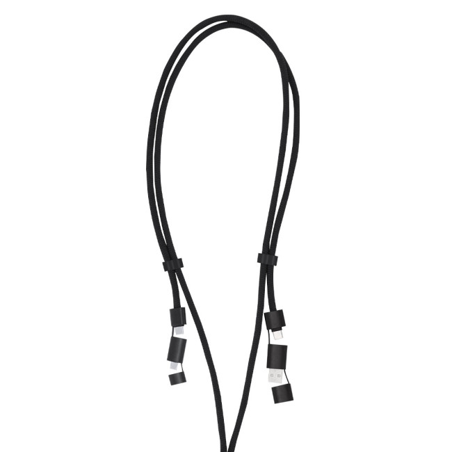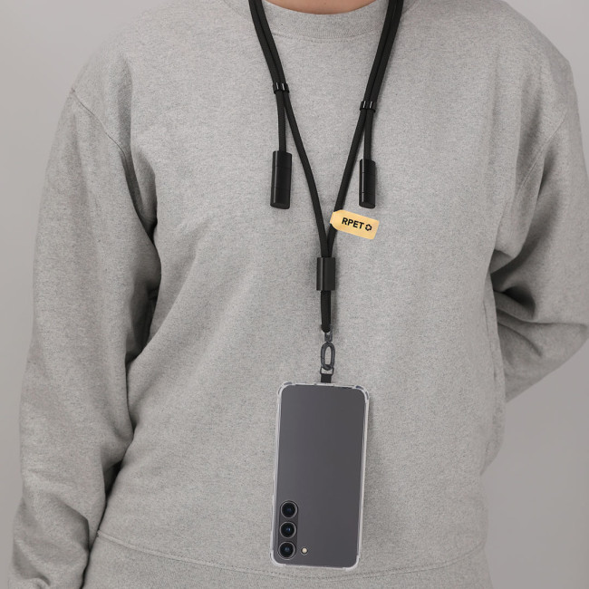 Innovativo lanyard con funzione di supporto e cavo caricatore, realizzato in una combinazione di poliestere RPET e alluminio riciclato. Progettato per essere facilmente posizionato tra la custodia e lo smartphone grazie al suo accessorio di trasporto. Include nastro coordinato, moschettone girevole in metallo nero e accessorio di sicurezza per il collo. Offre funzionalità di ricarica e trasferimento dati, con ingresso USB e di tipo C, e uscite Micro USB, Lightning e di tipo C. Presenta un distintivo di RPET su etichetta kraft, evidenziando il suo impegno sostenibile.Il materiale RPET è realizzato a partire da plastica riciclata, per così incoraggiare il riutilizzo dei rifiuti plastici e contribuire alla sostenibilità del pianeta.L'alluminio riciclato è un materiale con possibilità di riciclaggio quasi infinite, senza perdere le sue proprietà originali e consumando meno energia in questo processo.Certificazione GRS (Global Recycled Standard / Standard di Riciclaggio Globale), che garantisce l'origine riciclata del materiale usato per fabbricare il prodotto.
