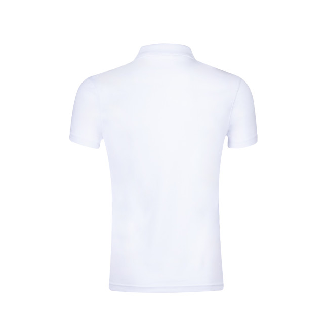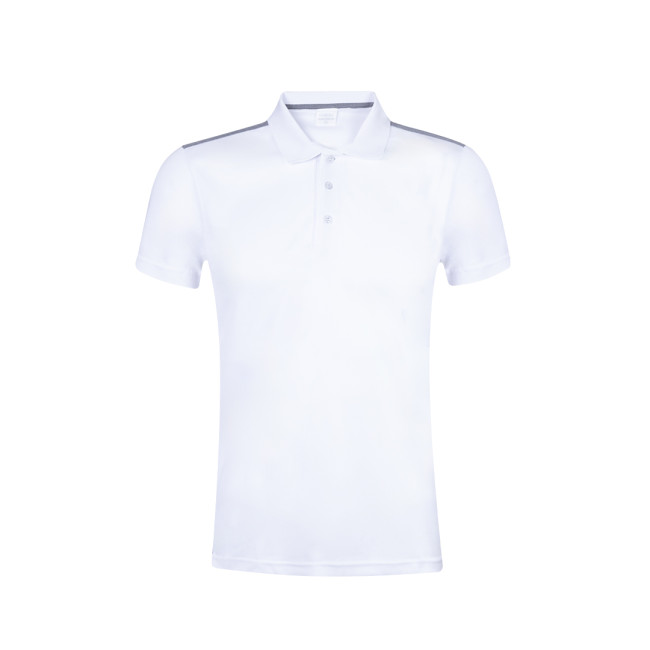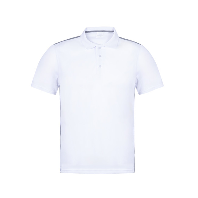 Polo tecnica per adulti in poliestere traspirante 180g / m2. Elegante design bicolore, bianco con dettagli grigi a contrasto. Disponibile nelle taglie S, M, L, XL, XXL. Colore bianco appositamente realizzato per la marcatura a sublimazione.
