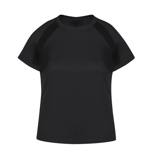 T-shirt tecnica da donna in materiale 100% poliestere traspirante da 135 g/m2. Con maniche raglan, girocollo e bande frontali e laterali in tessuto microforato traspirante. Disponibile nelle taglie S, M, L, XL.