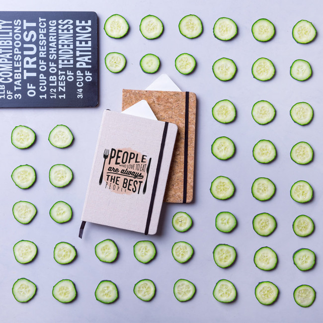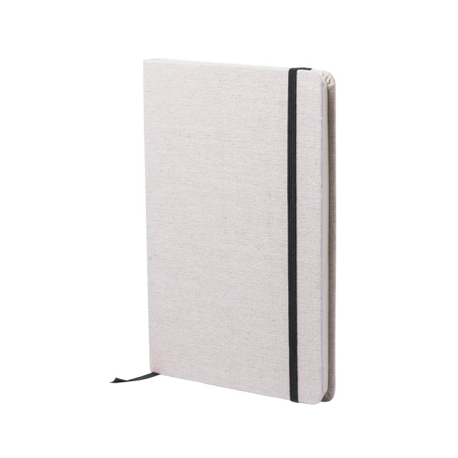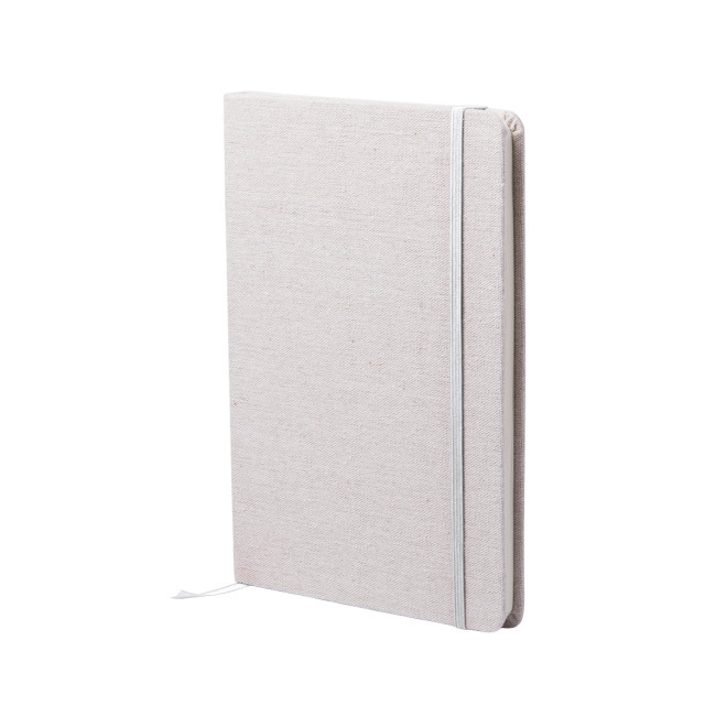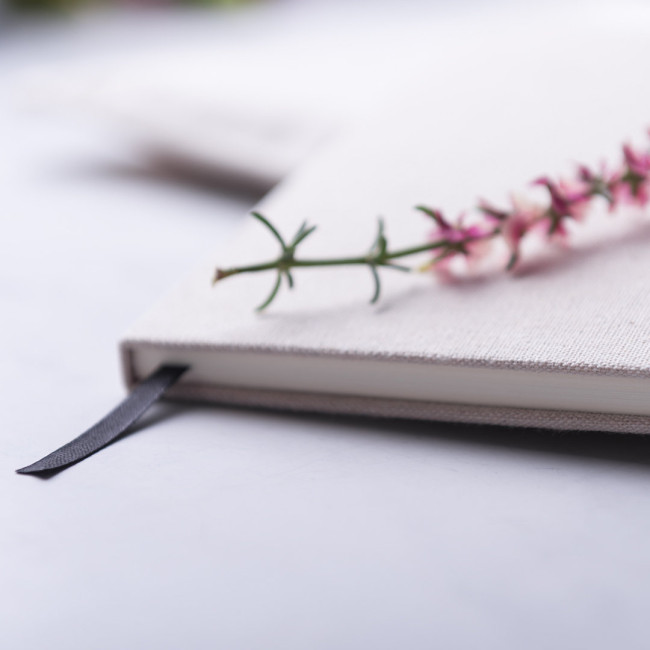 Block notes realizzato con materiali naturali. Copertina foderata in morbido cotone ecru, con chiusura elastica e segnalibro abbinato in colori vivaci. Include 80 fogli lisci.