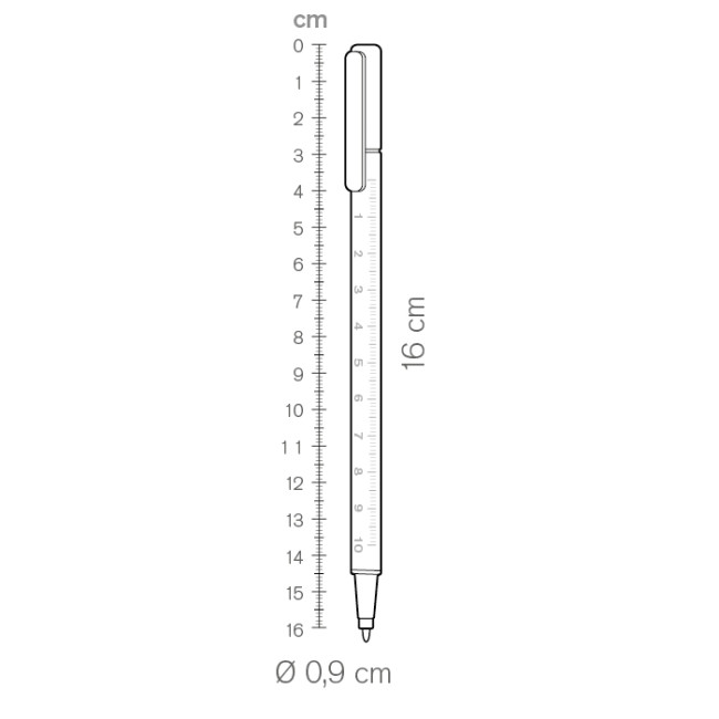penna a sfera triangolare corpo in plastica bianca con righello cm 10 cappuccio e minuterie in plastica colorata refill con sfera al tungsteno inchiostro nero tecnica di stampa consigliata: serigrafica - tampografica - UV