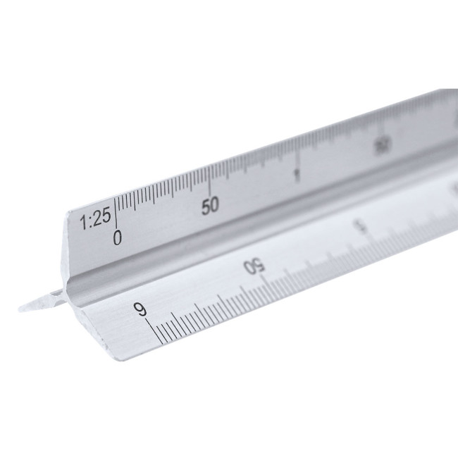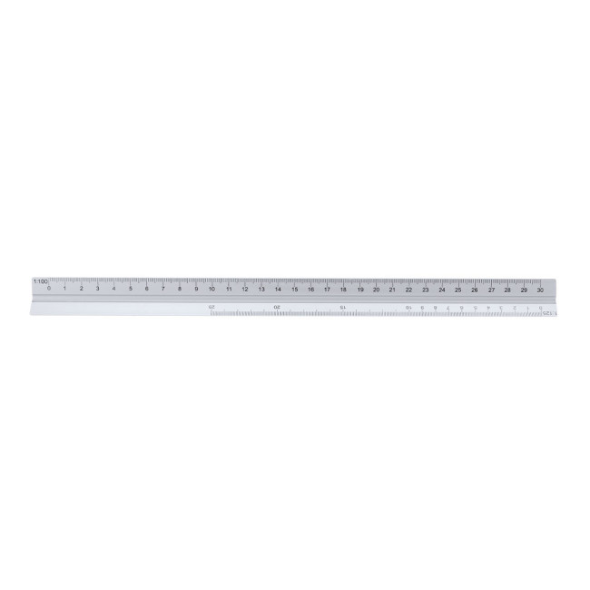 Scalimetro in alluminio con design triangolare da 30 cm. Scala 1:20/1:25/1:50/1:75/1:100. Con lato liscio per la stampa. Confezionato singolarmente.