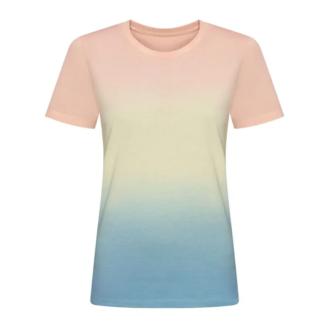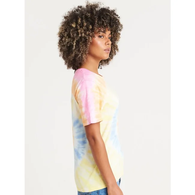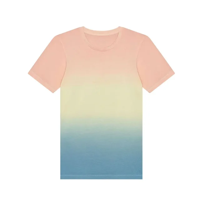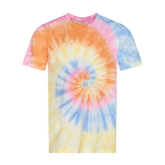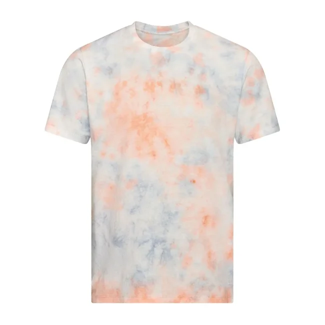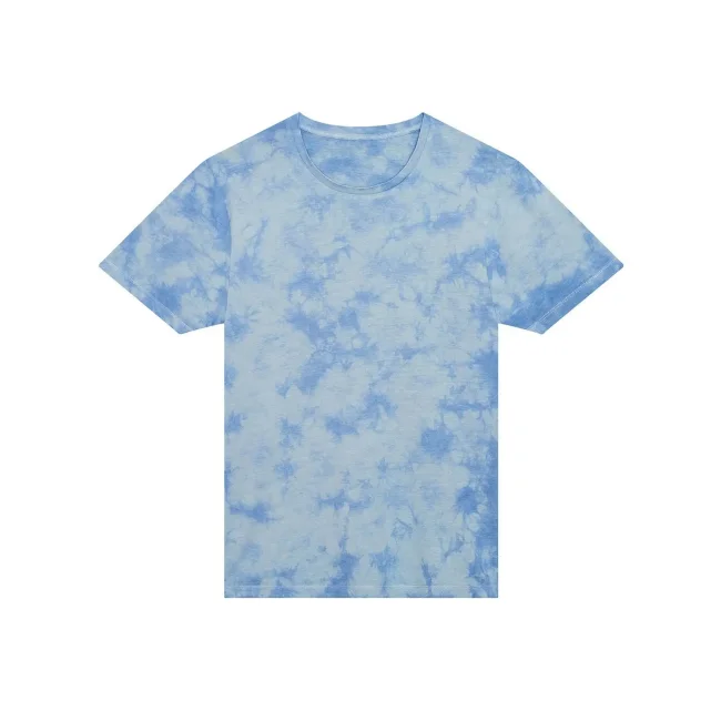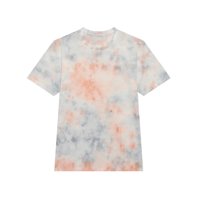 100% cotone. T-shirt a girocollo in stile tie-dye con cuciture laterali per un taglio moderno. Nastro di rinforzo sul collo, girocollo a costine, cuciture doppie sulla manica e sull'orlo inferiore. Superficie ideale per stampa o ricamo. Etichetta taglia, ideale per il rebranding. Ogni pezzo è unico e originale.