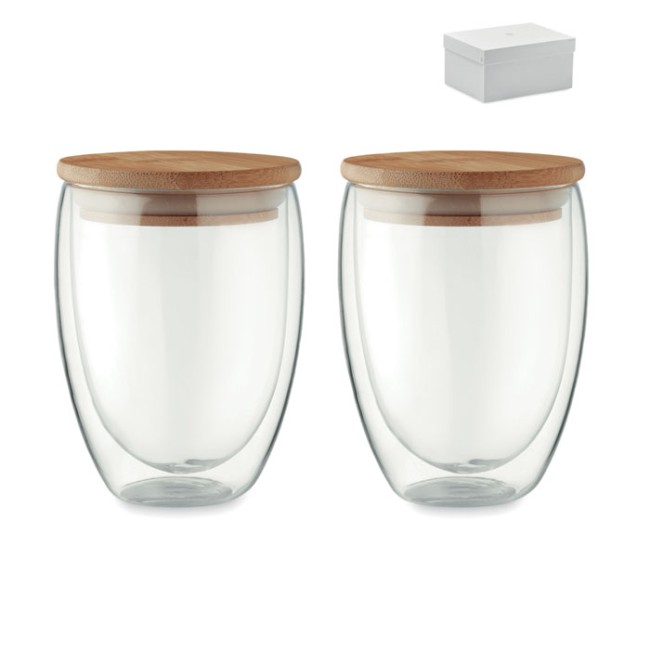 Set di 2 bicchieri in vetro borosilicato a doppio strato e coperchio in bamboo con anello in silicone. Capacità 350 ml.
