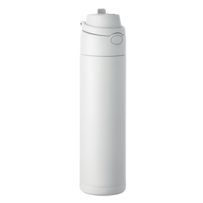 Bottiglia singolo strato in acciaio inox riciclato (90% inox riciclato e 10% acciaio inox). Dispone di una cannuccia 2 in 1 e di un coperchio in PP con manico. Senza perdite. Capacità: 650 ml.