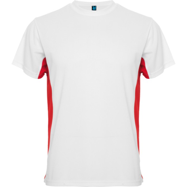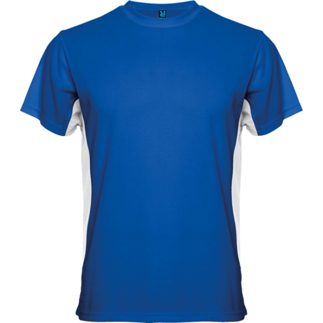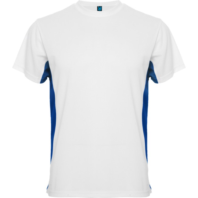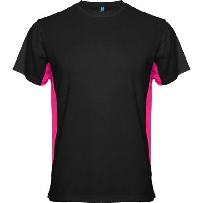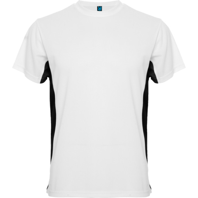 T-shirt girocollo tecnica manica corta, bicolore.1.- Griocollo con cuciture rinforzate.2.- Contrasto laterale.
