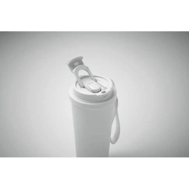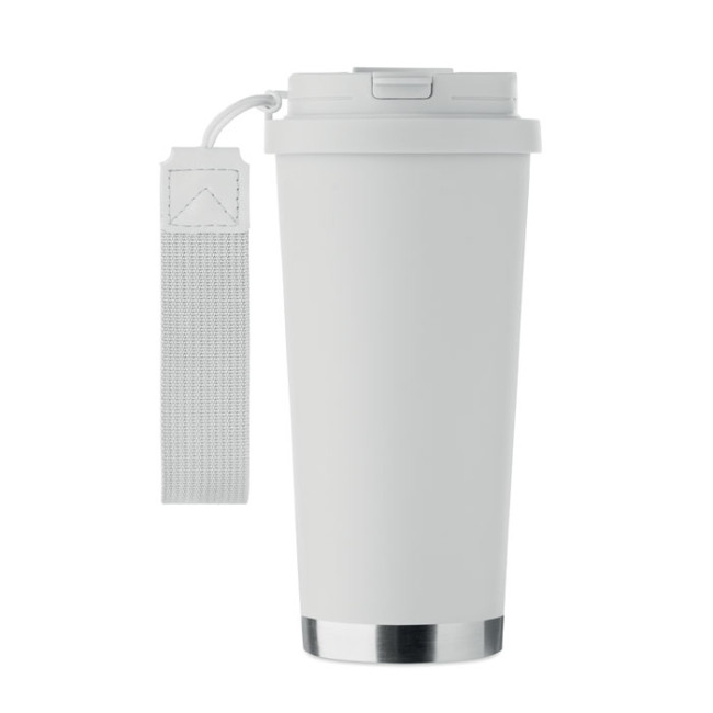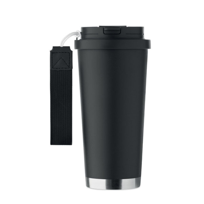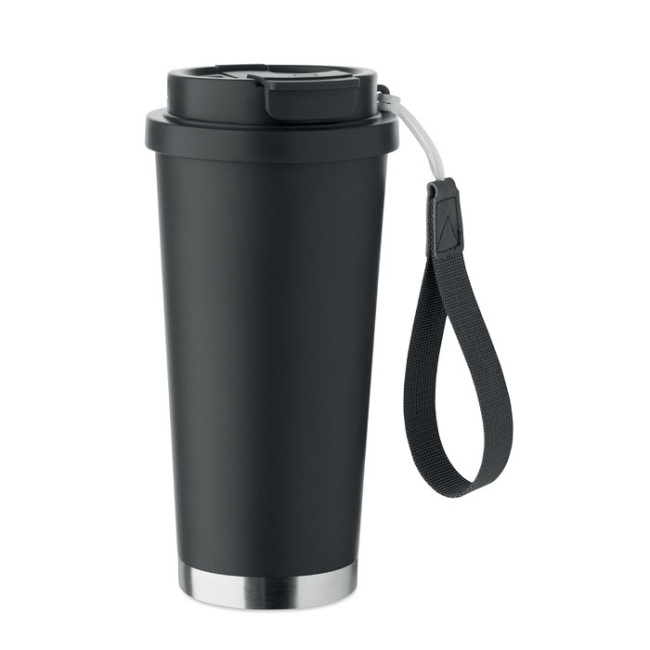 Bicchiere a doppio strato in acciaio inox riciclato con coperchio in PP (coperchio 2 in 1 per bere e cannuccia) e tracolla in RPET. Senza perdite. Capacità: 500 ml.