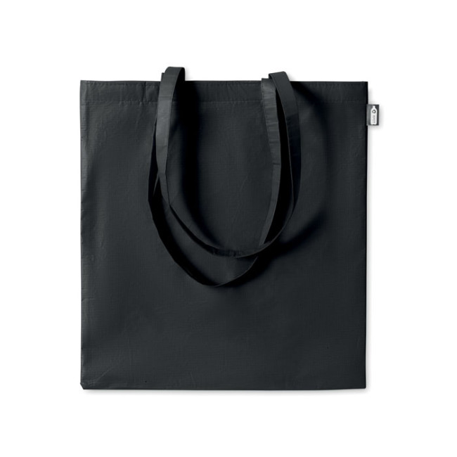 Shopping bag RPET in TNT laminato con manici lunghi. Un design classico per una borsa realizzata per trasportare la spesa quotidiana o altri oggetti. Comoda da indossare a mano o a tracolla, grazie ai manici lunghi. La plastica PET riciclata rende questa borsa una scelta sostenibile. 100 gr / m².